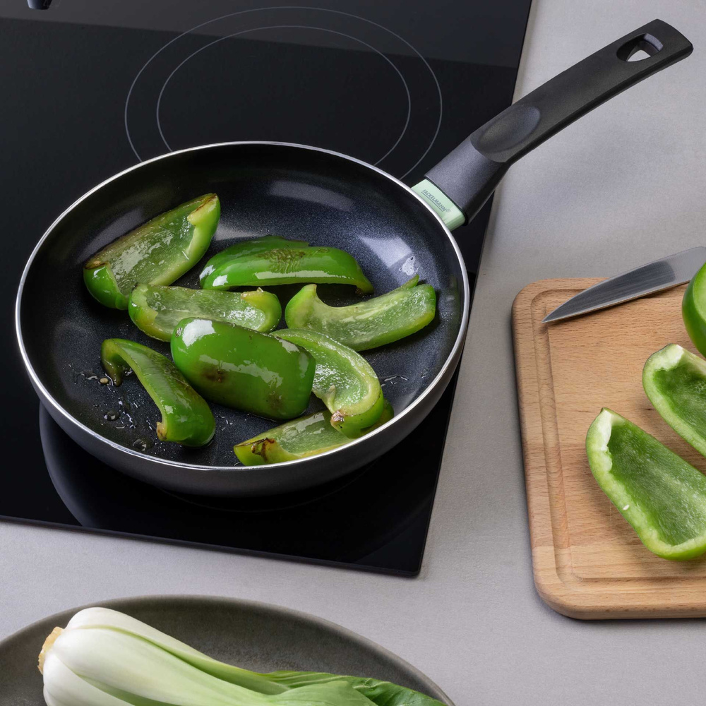 Wykonana z recyklingowanego aluminium, patelnia Brandao charakteryzuje się solidnym korpusem, który zapewnia trwałość i odporność na uszkodzenia. Czarna powłoka ceramiczna, wolna od PFAS, gwarantuje doskonałe właściwości nieprzywierające, co pozwala na zdrowe gotowanie z minimalną ilością tłuszczu. ✔