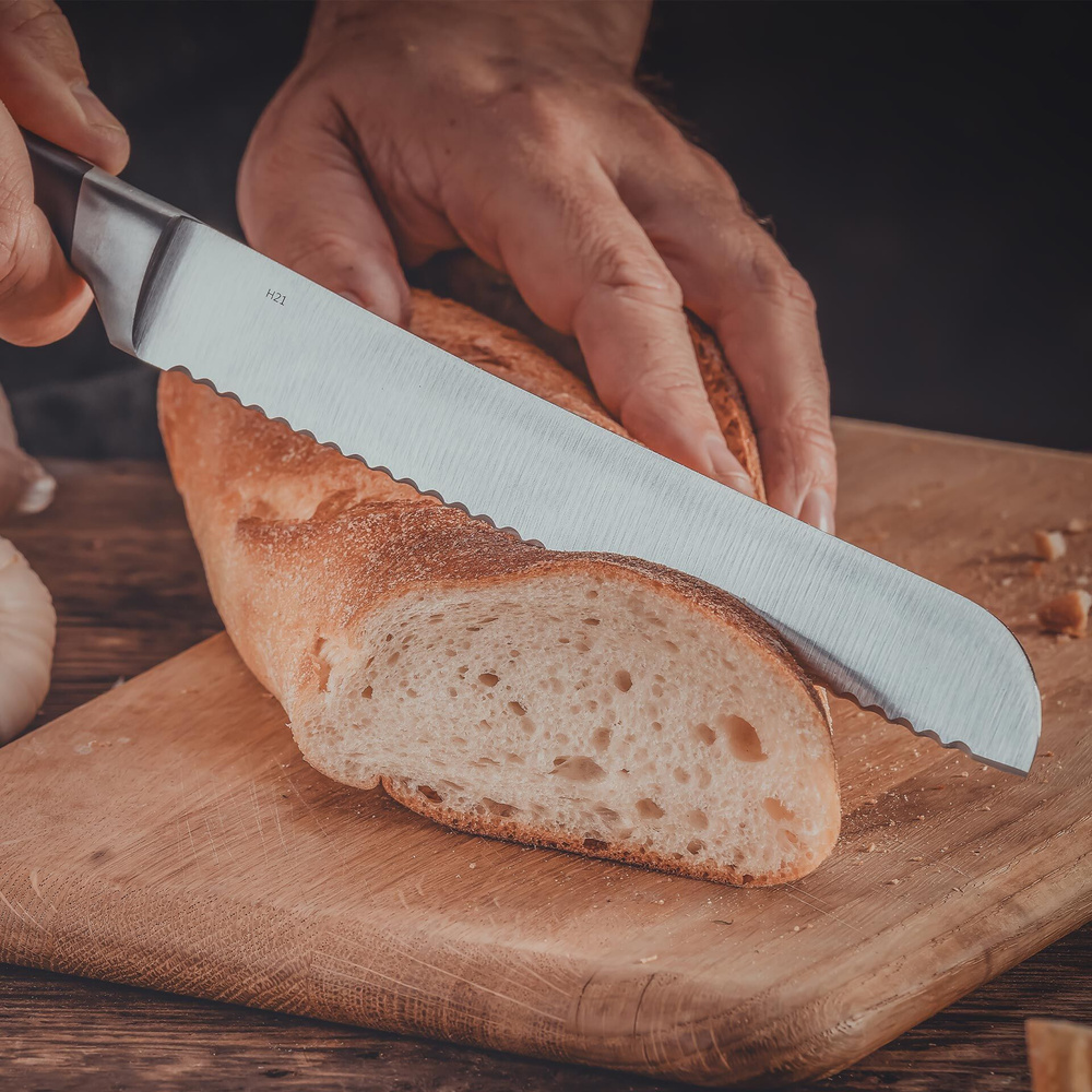 Wyprofilowany jelec chroni palce, zapewniając bezpieczeństwo podczas krojenia, co sprawia, że nóż jest idealny do użytku zarówno dla profesjonalistów, jak i amatorów. 🔥 Możesz nim kroić nie tylko świeży chleb, ale także twarde skórki owoców i warzyw, takich jak ananas czy dynia.