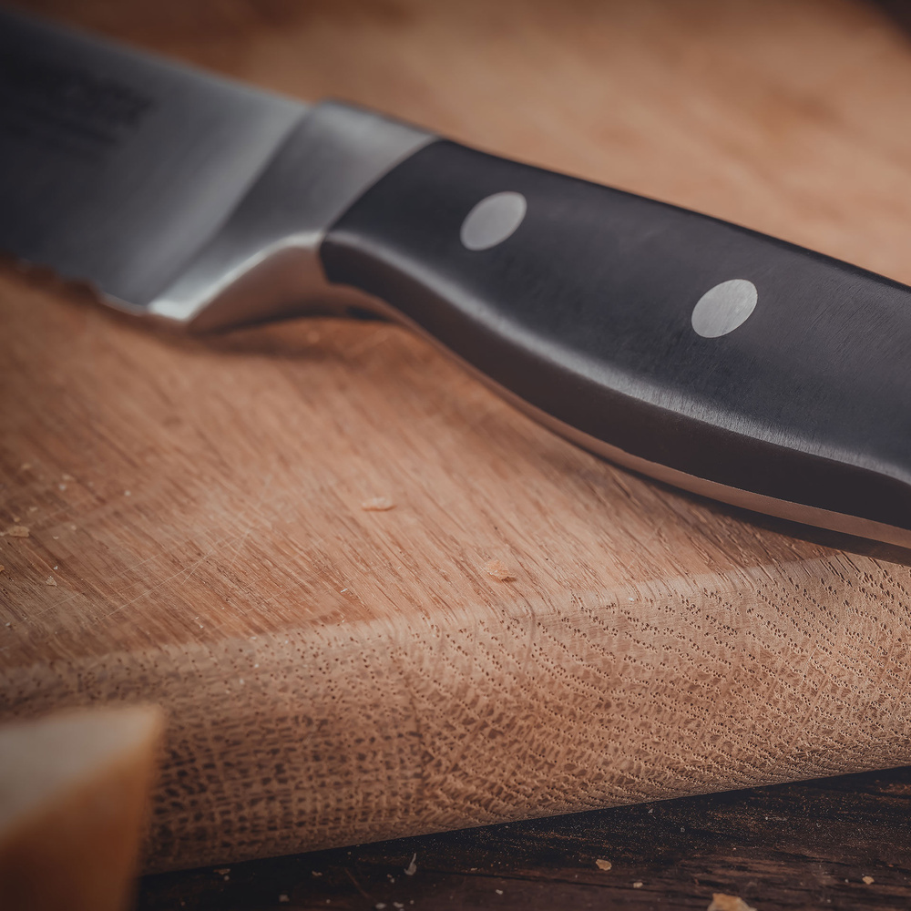 Wykonany z wysokostopowej stali chromowo-molibdenowo-wanadowej, nóż zapewnia długotrwałą ostrość, co czyni go niezastąpionym w każdej kuchni. Ergonomiczny uchwyt POM gwarantuje komfort i pewność chwytu, co jest niezwykle ważne podczas codziennego użytkowania. ✔
