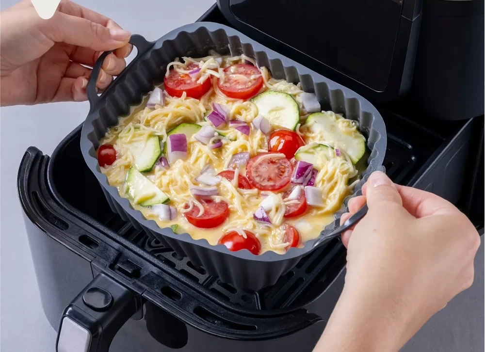 Kwadratowy wkład silikonowy o wymiarach 15x15 cm to innowacyjne akcesorium do frytkownic beztłuszczowych, które umożliwia przygotowanie potraw bez użycia tłuszczu. Wykonany z silikonu spożywczego, jest wolny od BPA, co zapewnia bezpieczeństwo użytkowania oraz brak wchłaniania zapachów. ⭐