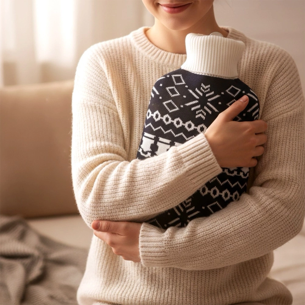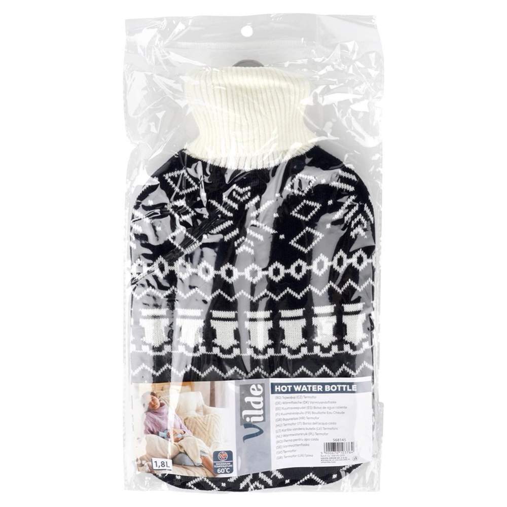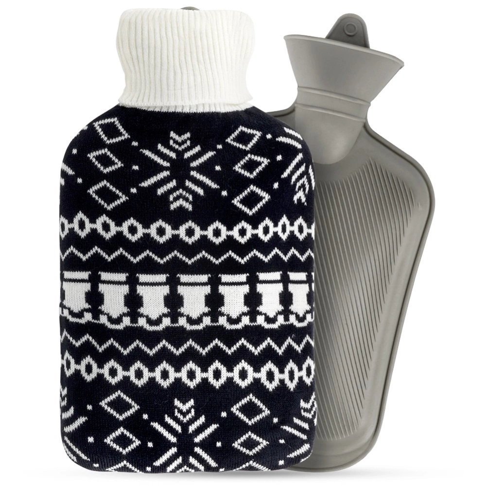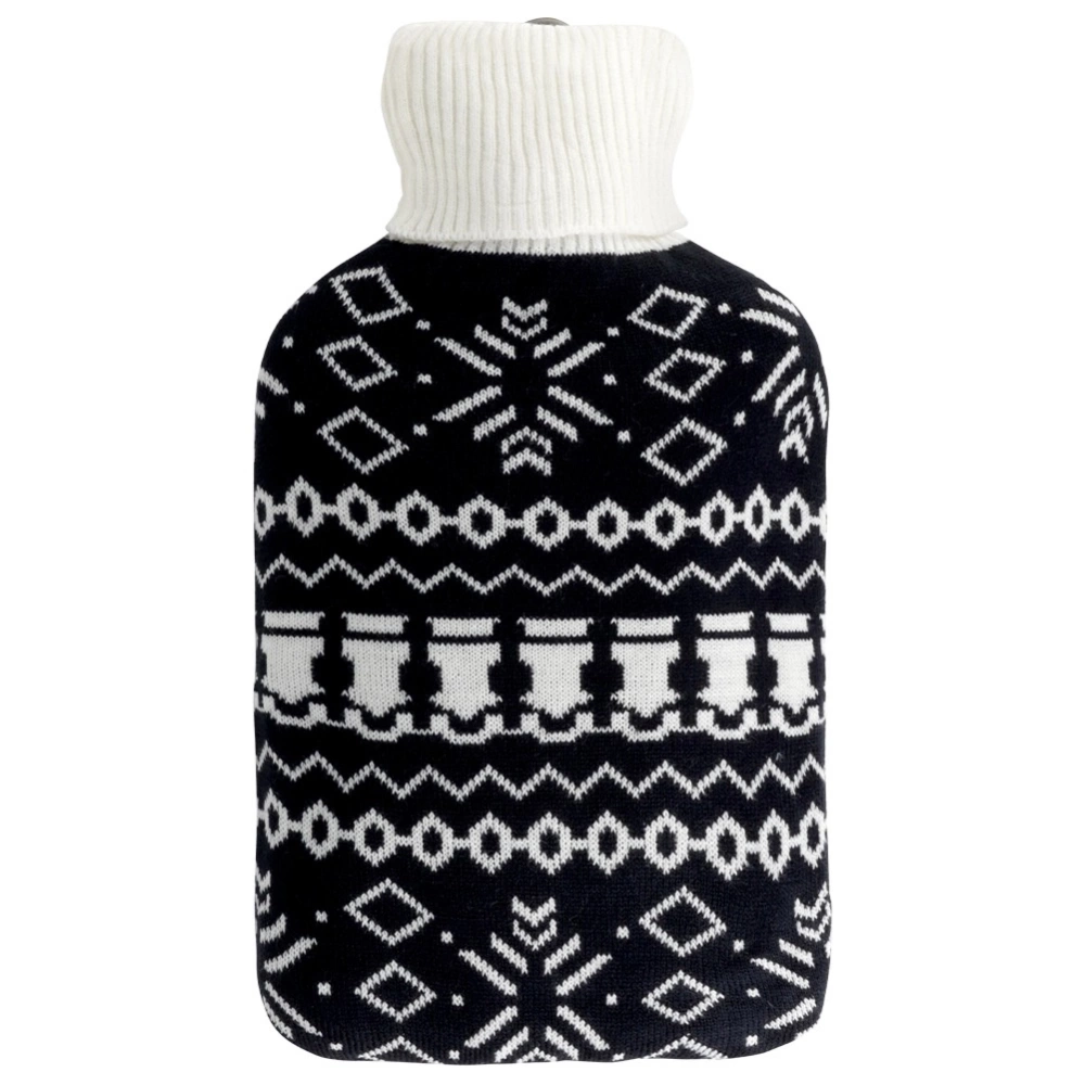 - Praktyczny termofor o pojemności 1,8 l - Termofor gumowy w sweterkowym pokrowcu. Pokrowiec posiada klasyczny, zimowy wzór w formie geometrycznych wzorów w kontrastowej kolorystyce granatu i bieli. Rozgrzeje w jesienno-zimowe wieczory, zapewni komfort i wprawi w dobry nastrój. Termofor ma pojemność 1,8 l (napełniamy go wodą) i wymiary 20 x 35 cm.