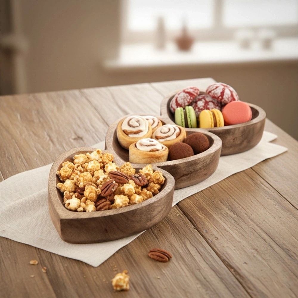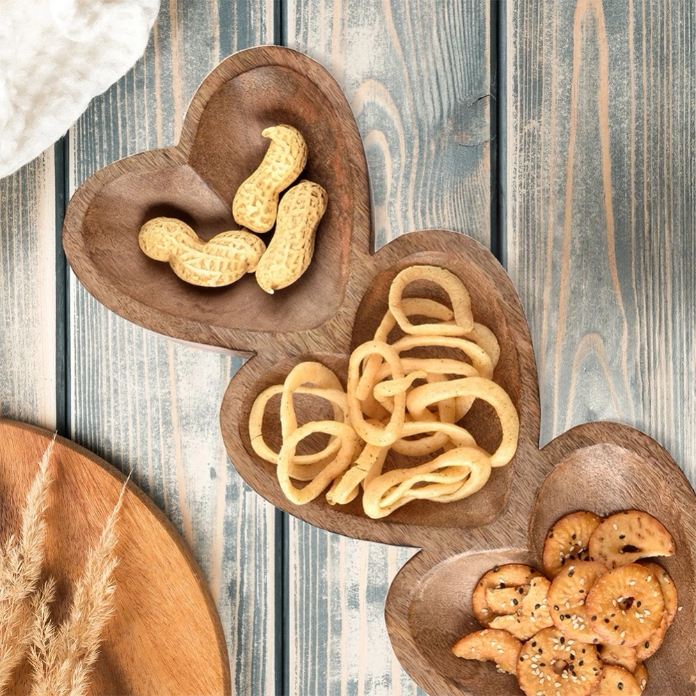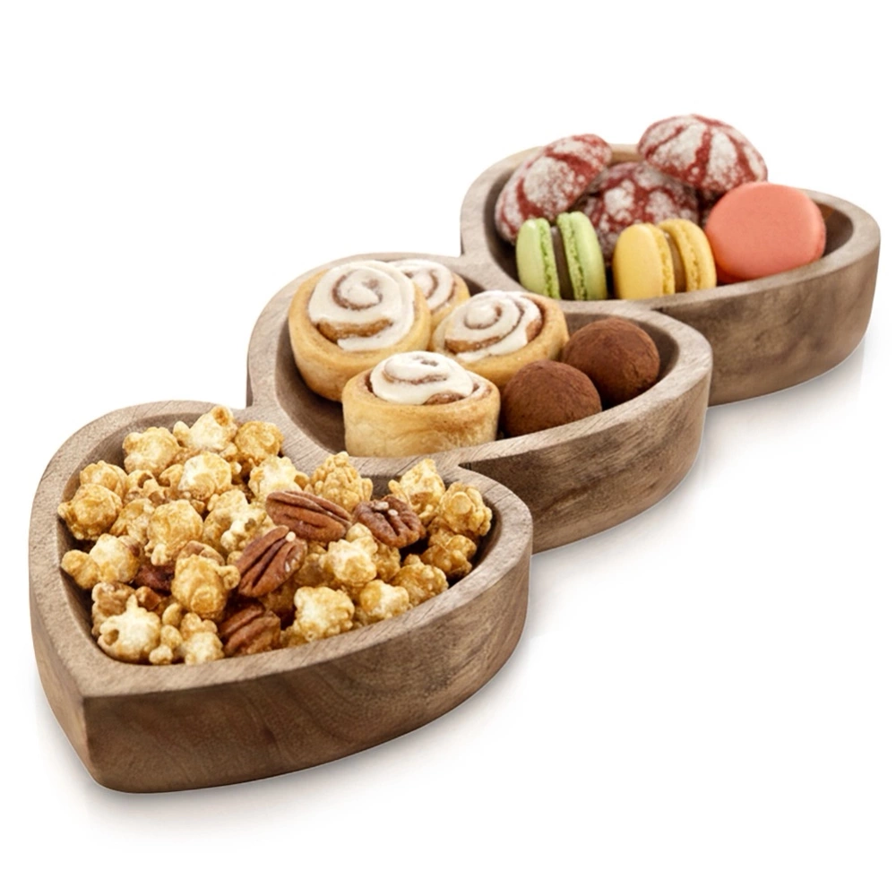 - Talerz do serwowania przekąsek słodkich lub słonych podzielony jest na trzy części w kształcie serc. Wykonany w całości, ręcznie z drewna mangowca.