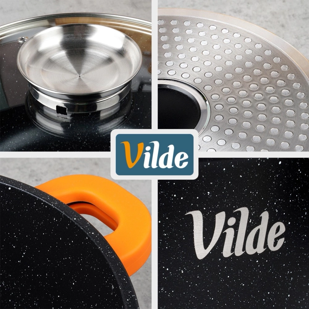 Duży garnek z pokrywką z dozownikiem oraz silikonowymi uchwytami, idealny do gotowania, pieczenia, duszenia i smażenia potraw. Przygotowane w nim dania są soczyste i aromatyczne. Garnek jest trwały, funkcjonalny i idealny do bezpośredniego serwowania dań na stole. Oryginalny produkt marki Vilde z linii Terruna Aroma. Wyprodukowano zgodnie z europejskimi standardami.