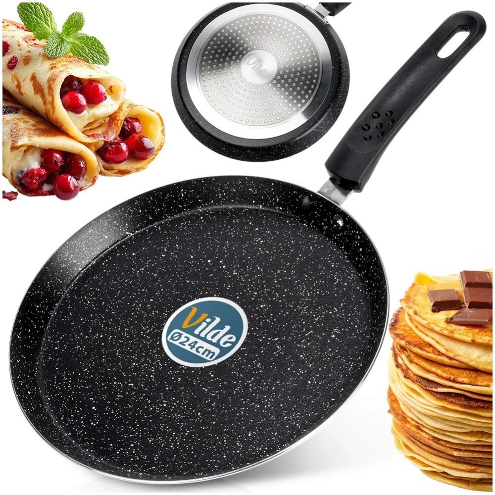 Nieprzywierająca patelnia do naleśników o wyjątkowym, ponadczasowym wyglądzie. Patelnia posiada modny design, dzięki czemu efektownie prezentuje się w kuchni. Z jej pomocą usmażymy pyszne naleśniki, placki, jak i omlety. Niezastąpiona w każdej kuchni, ułatwia gotowanie i nadaje potrawom perfekcyjny wygląd. Wykonana z najwyższej jakości materiałów, odpowiednio użytkowana posłuży długie lata. Oryginalny produkt marki Vilde z linii Basic Line. Wyprodukowano zgodnie z europejskimi standardami.