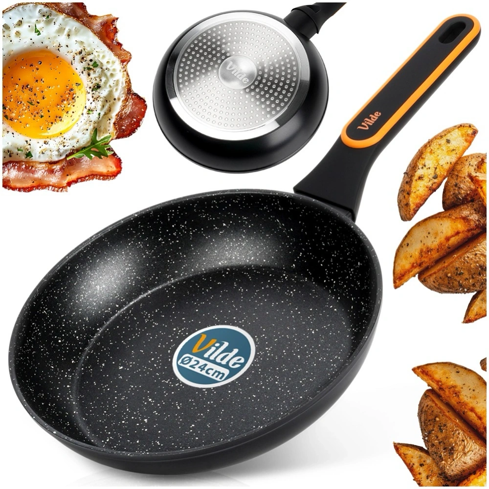 Nieprzywierająca patelnia o wyjątkowym, ponadczasowym wyglądzie. Patelnia posiada modny design, dzięki czemu efektownie prezentuje się w kuchni. Niezastąpiona w każdej kuchni, ułatwia gotowanie, smażenie i duszenie potraw. Wykonana z najwyższej jakości materiałów, odpowiednio użytkowana posłuży długie lata. Oryginalny produkt marki Vilde z linii Terruna. Wyprodukowano zgodnie z europejskimi standardami.