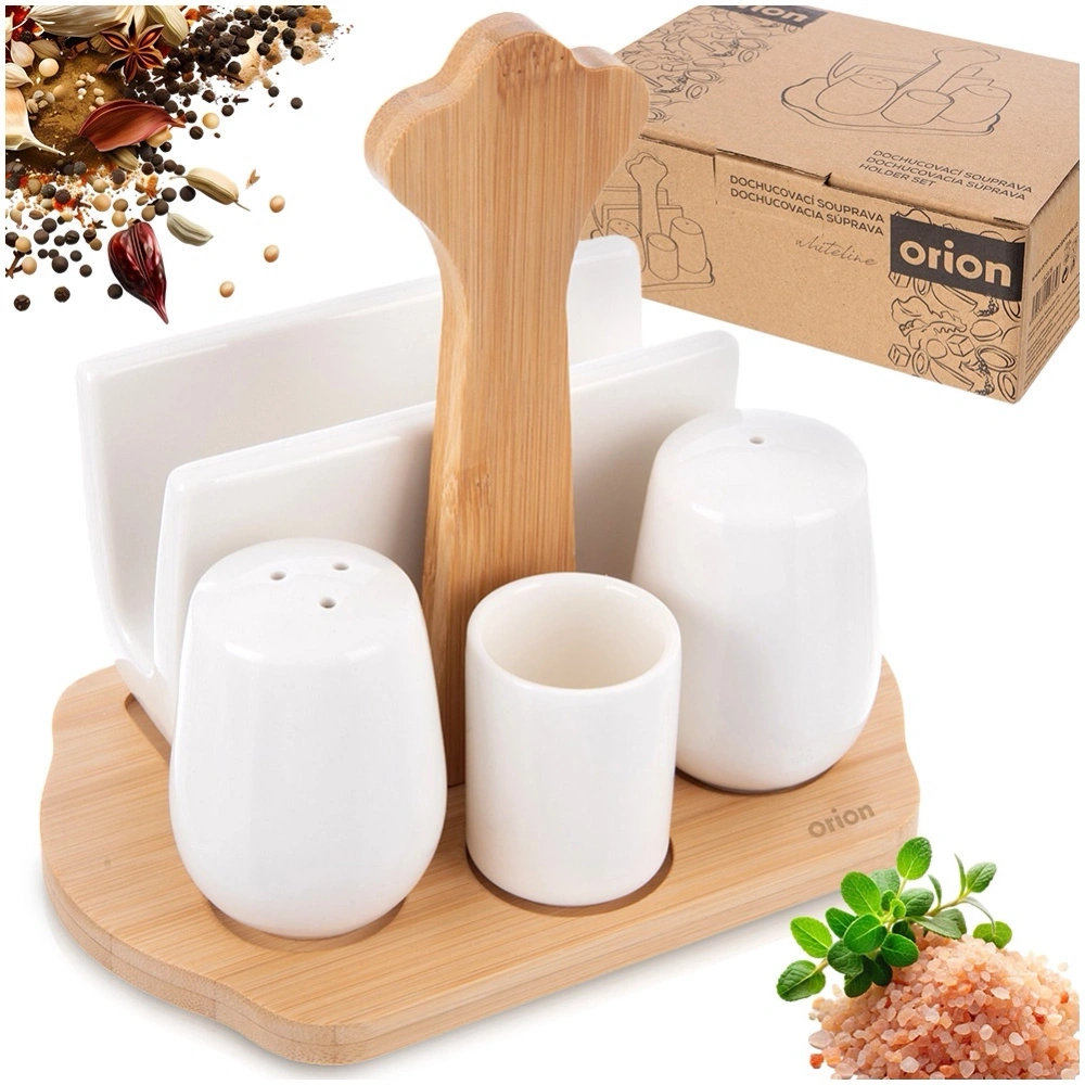 Zestaw porcelanowych pojemników na sól i pieprz, pojemnik na wykałaczki oraz serwetnik umieszczone są na bambusowej podstawie. Łatwe w czyszczeniu i użytkowaniu. Nowoczesny design świetnie wkomponuje się w każdą aranżację jadalni oraz kuchni. Sprawdzi się zarówno w codziennym użytku, jak i podczas wyjątkowych okazji, np. podczas przyjęć. Zestaw można wykorzystać również w lokalach gastronomicznych. Oryginalny produkt czeskiej marki Orion. Wyprodukowano zgodnie z europejskimi standardami.