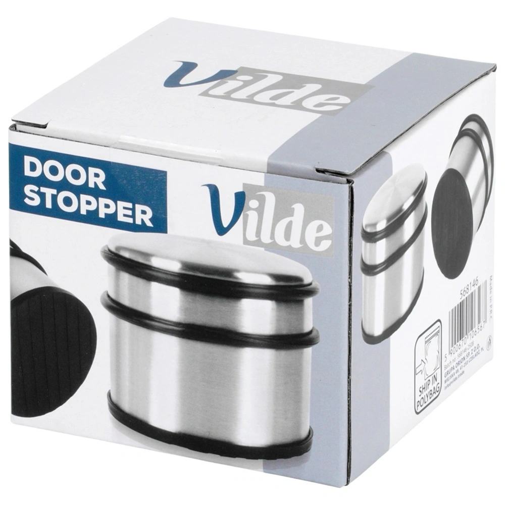 - Stoper do drzwi wykonany ze stali nierdzewnej. Stoper jest ciężki i nie wymaga montażu. Posiada gumowe elementy, które zabezpieczą drzwi oraz podłogę przed uszkodzeniem.