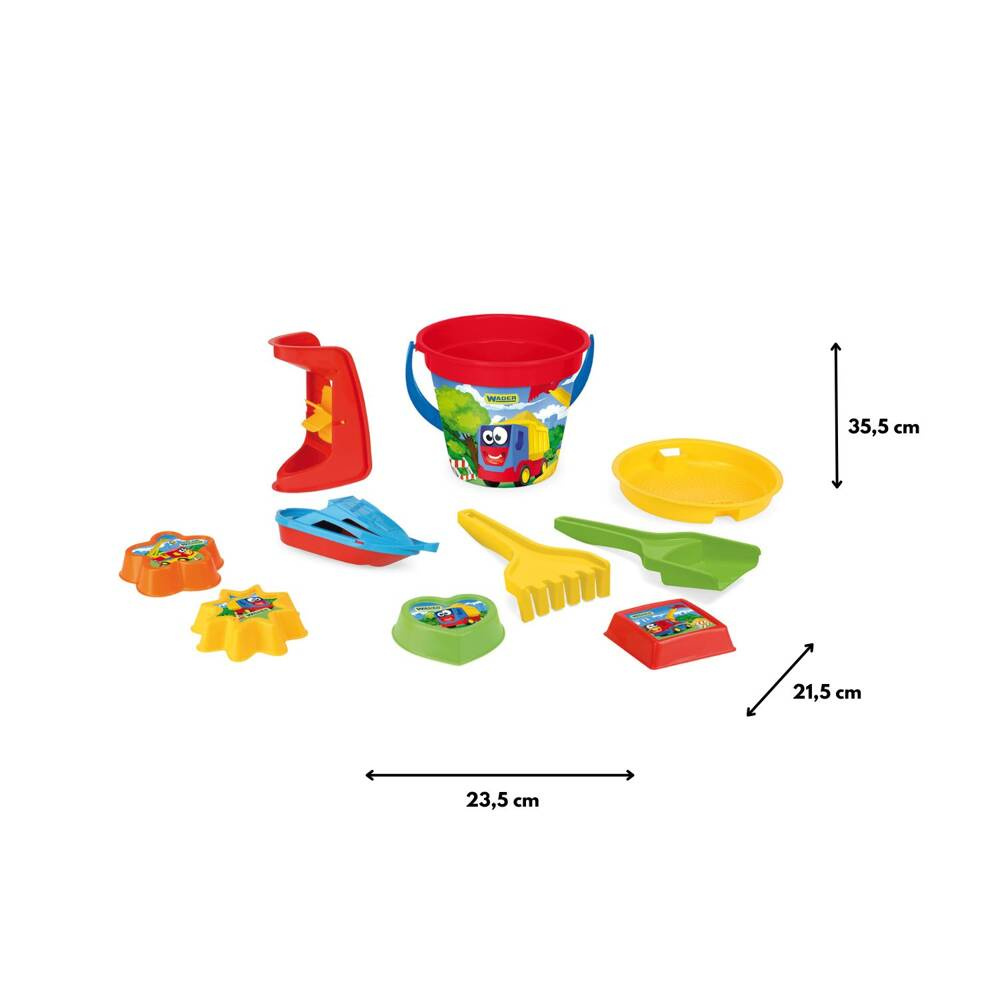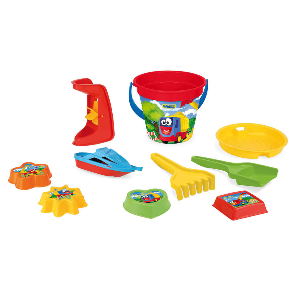 - zestaw 2: łopatka, grabki, 4 foremki (kwadrat, serduszko, gwiazdka i kwiatek), sitko, motorówka, młynek do piasku i wiaderko o pojemności 3,4 l