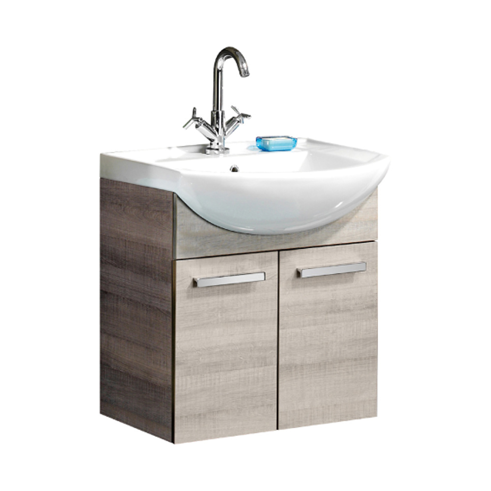 - Zestaw mebli łazienkowych z serii A-Vero, w skład którego wchodzą szafka pod umywalkę o szerokości 62,4 cm oraz umywalka ceramiczna.