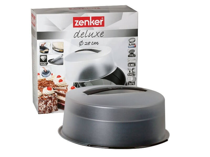 - Tortownica okrągła z pokrywą marki ZENKER niemieckiej firmy Fackelmann zapewnia równomierne ogrzewanie się naczynia. Blacha posiada podwójną powłokę teflonową - ilag, dzięki której ciasto nie przywiera do formy i w szybki oraz łatwy sposób można wyciągnąć