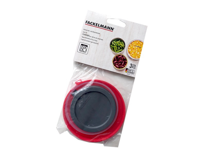 Zamknięcia, pokrywki do puszek niemieckiej firmy Fackelmann wykonane z tworzywa sztucznego.