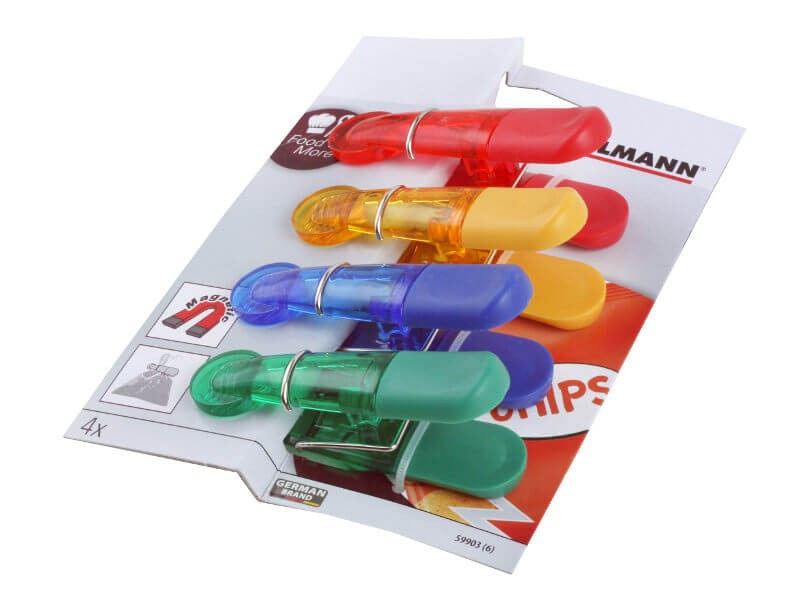 Kolorowe klipsy z magnesem niemieckiej firmy Fackelmann wykonane z tworzywa sztucznego o uniwersalnym zastosowaniu w kuchni, domu, pracy czy ogrodzie. Idealne jako przypominajki na lodówkę (posiadają magnes) lub klipsy do torebek z żywnością. W komplecie znajdują się cztery sztuki w czterech różnych kolorach czerwony, żółty, niebieski oraz zielony.