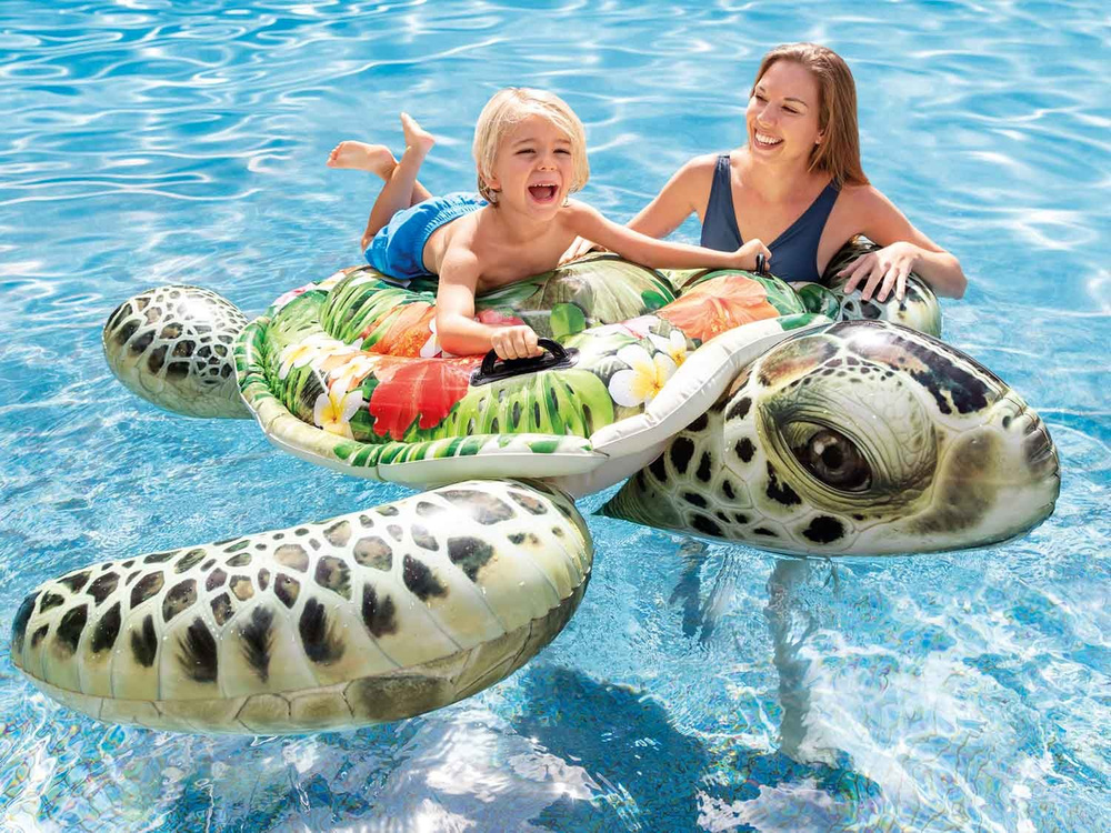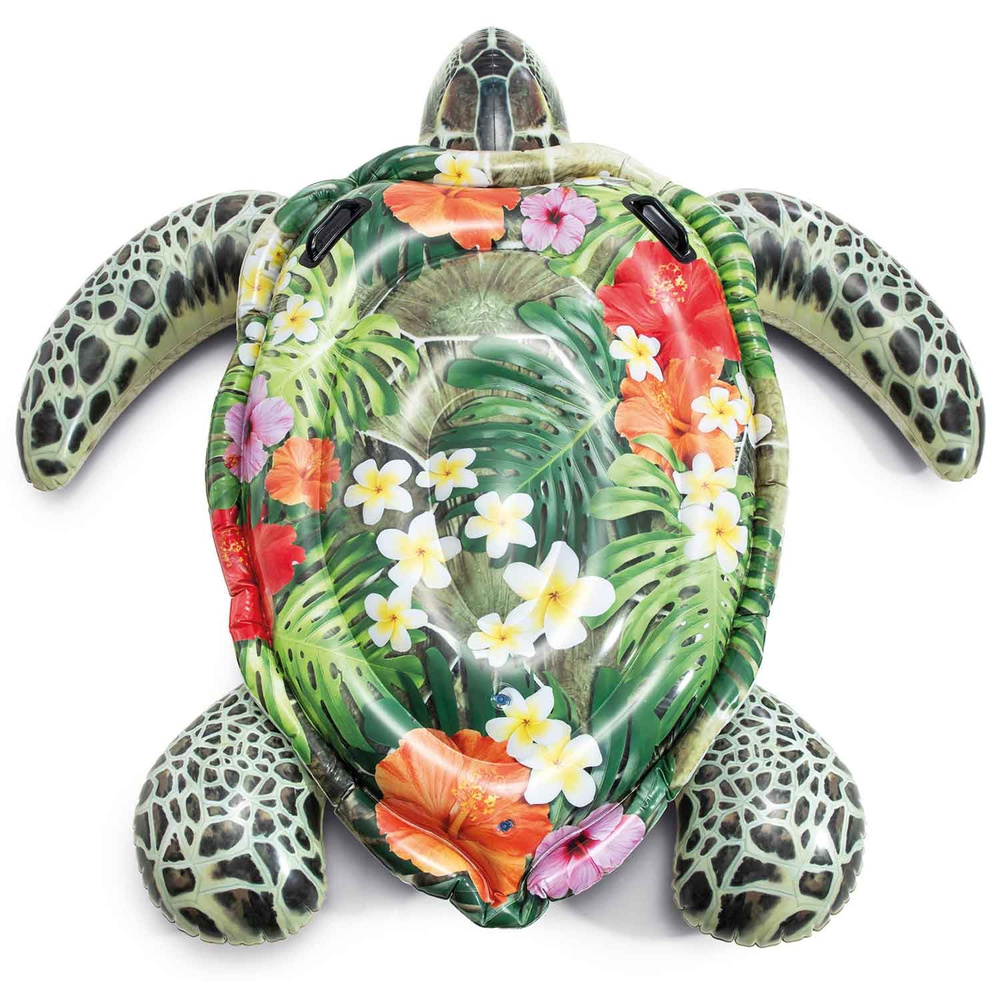 - Zabawka do pływania przypominająca ogromnego żółwia morskiego. Wymiary to 191 x 170 cm. Produkt posiada 2 mocne uchwyty ułatwiające utrzymanie równowagi. Żółw ma 2 oddzielne komory powietrzne, został wykonany z mocnego PCV.
