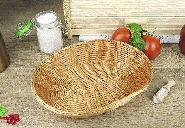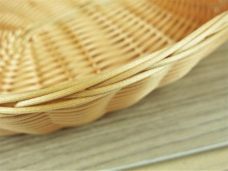 - Praktyczny koszyk wykonany z tworzywa imitującego wiklinę, świetnie sprawdzi się jako dekoracyjny pojemnik na pieczywo lub owoce.