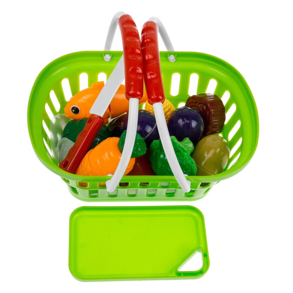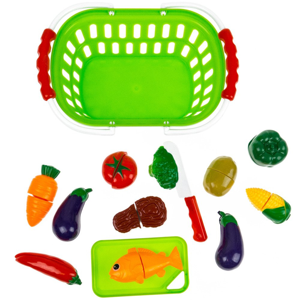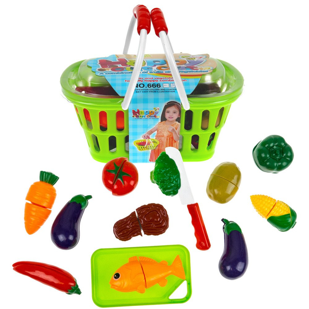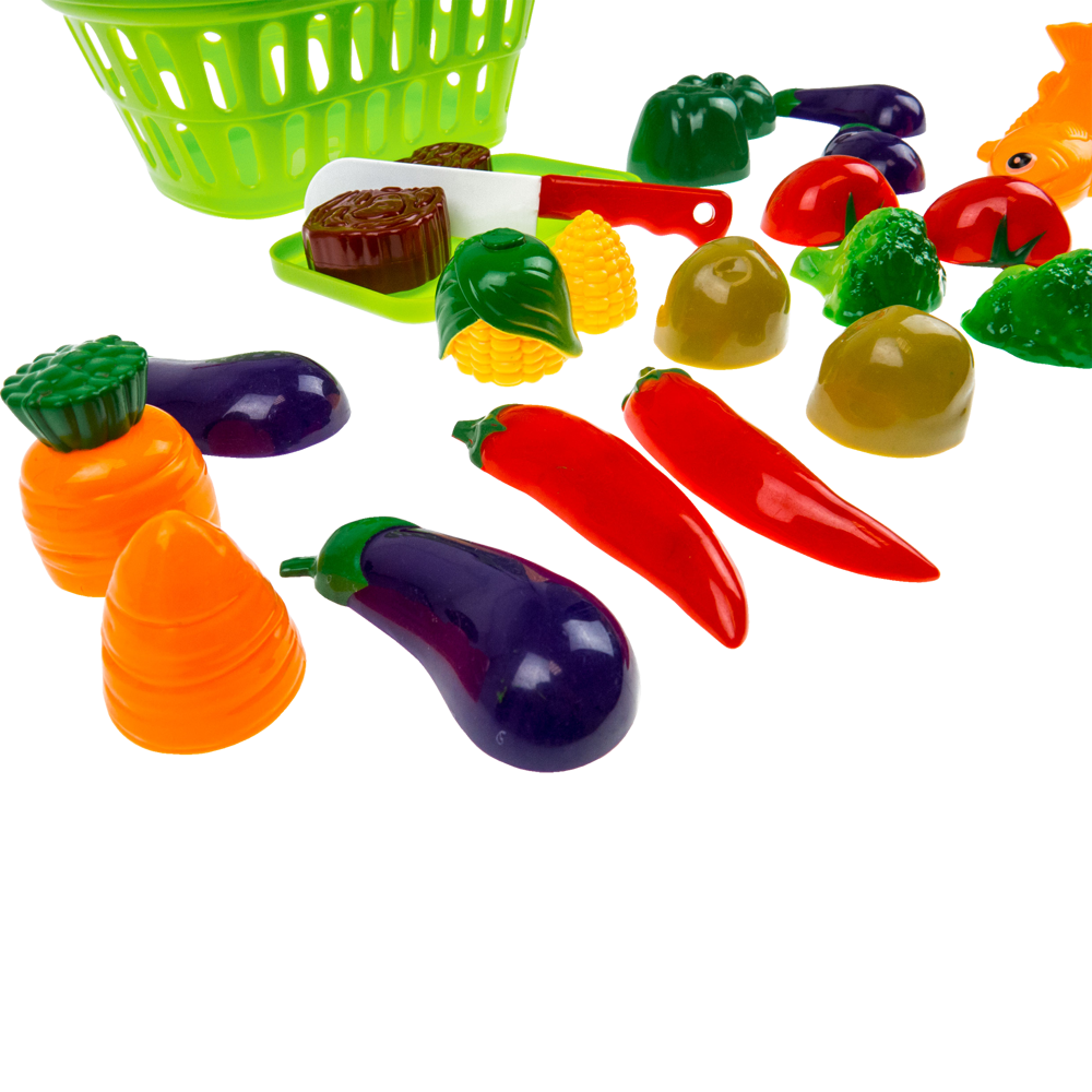 Maluch w koszyku znajdzie mnóstwo warzyw i innych artykułów spożywczych. Każdy artykuł można pokroić za pomocą dołączonego do zestawu nożyka. Dziecko nauczy się rozpoznawać warzywa - papryka zielona, brokuł, ostra papryczka, ziemniak, bakłażan, kukurydza, pomidor ,marchewka, ryba, stek, również w zestawie jest nożyk i deska do krojenia. To doskonały pomysł na naukę przez zabawę.