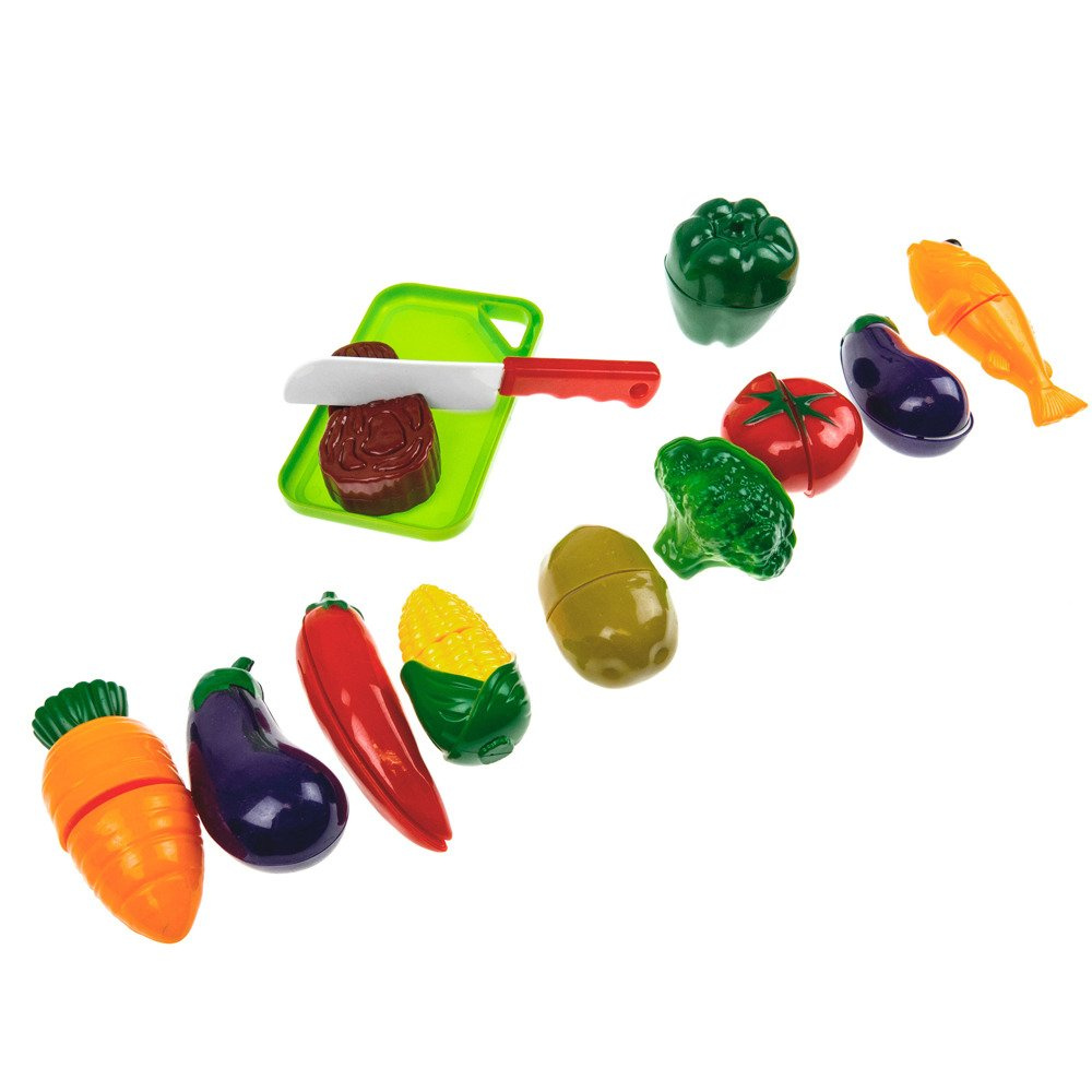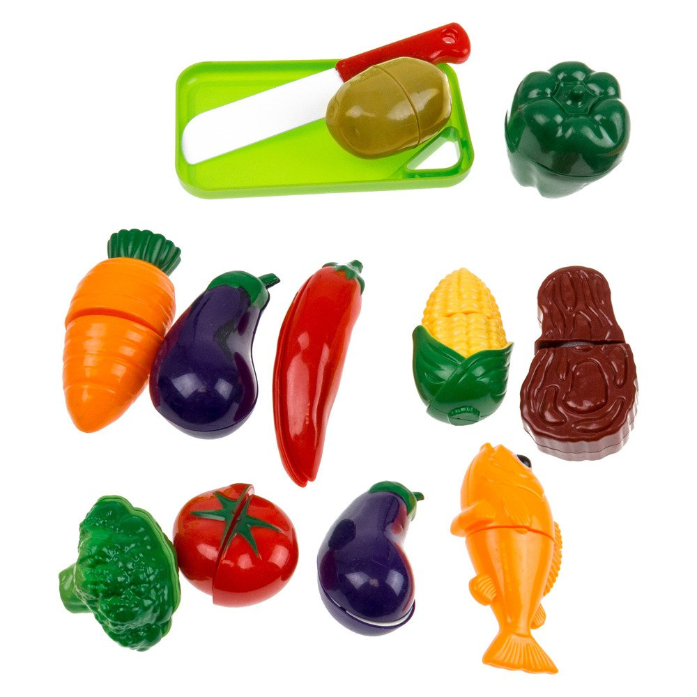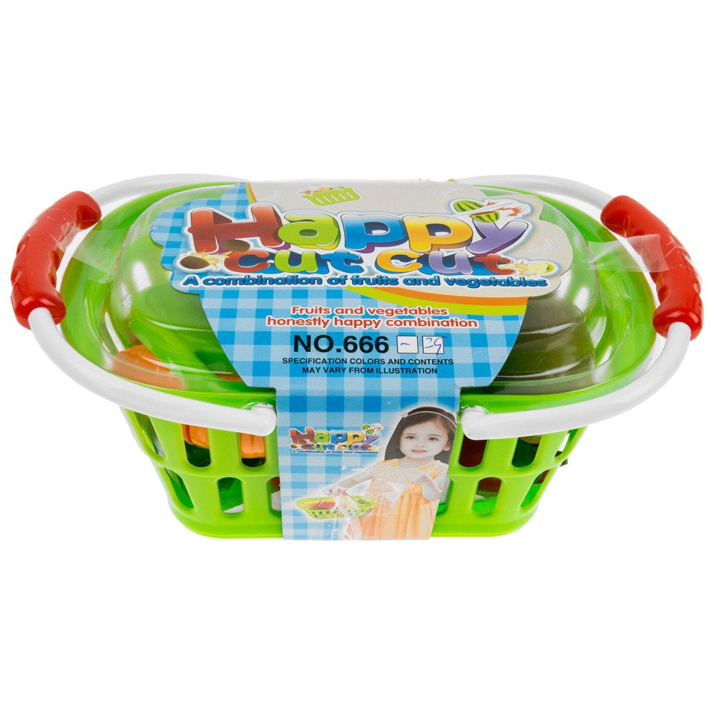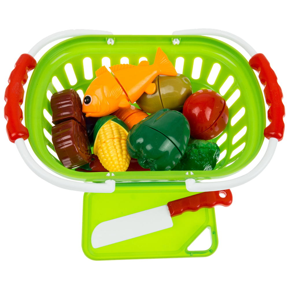 Maluch w koszyku znajdzie mnóstwo warzyw i innych artykułów spożywczych. Każdy artykuł można pokroić za pomocą dołączonego do zestawu nożyka. Dziecko nauczy się rozpoznawać warzywa - papryka zielona, brokuł, ostra papryczka, ziemniak, bakłażan, kukurydza, pomidor ,marchewka, ryba, stek, również w zestawie jest nożyk i deska do krojenia. To doskonały pomysł na naukę przez zabawę.