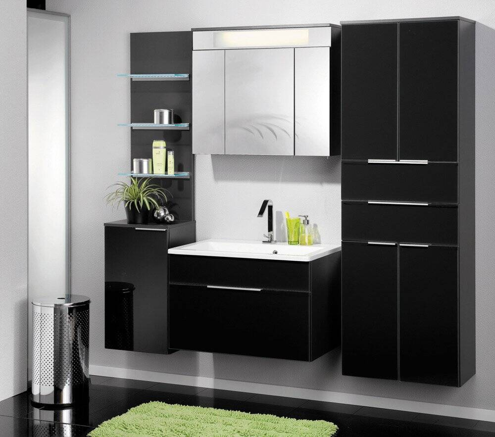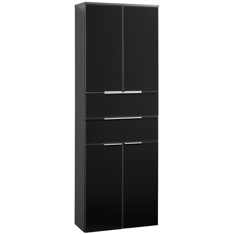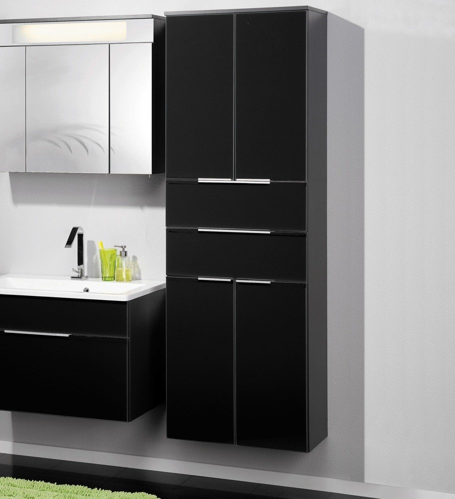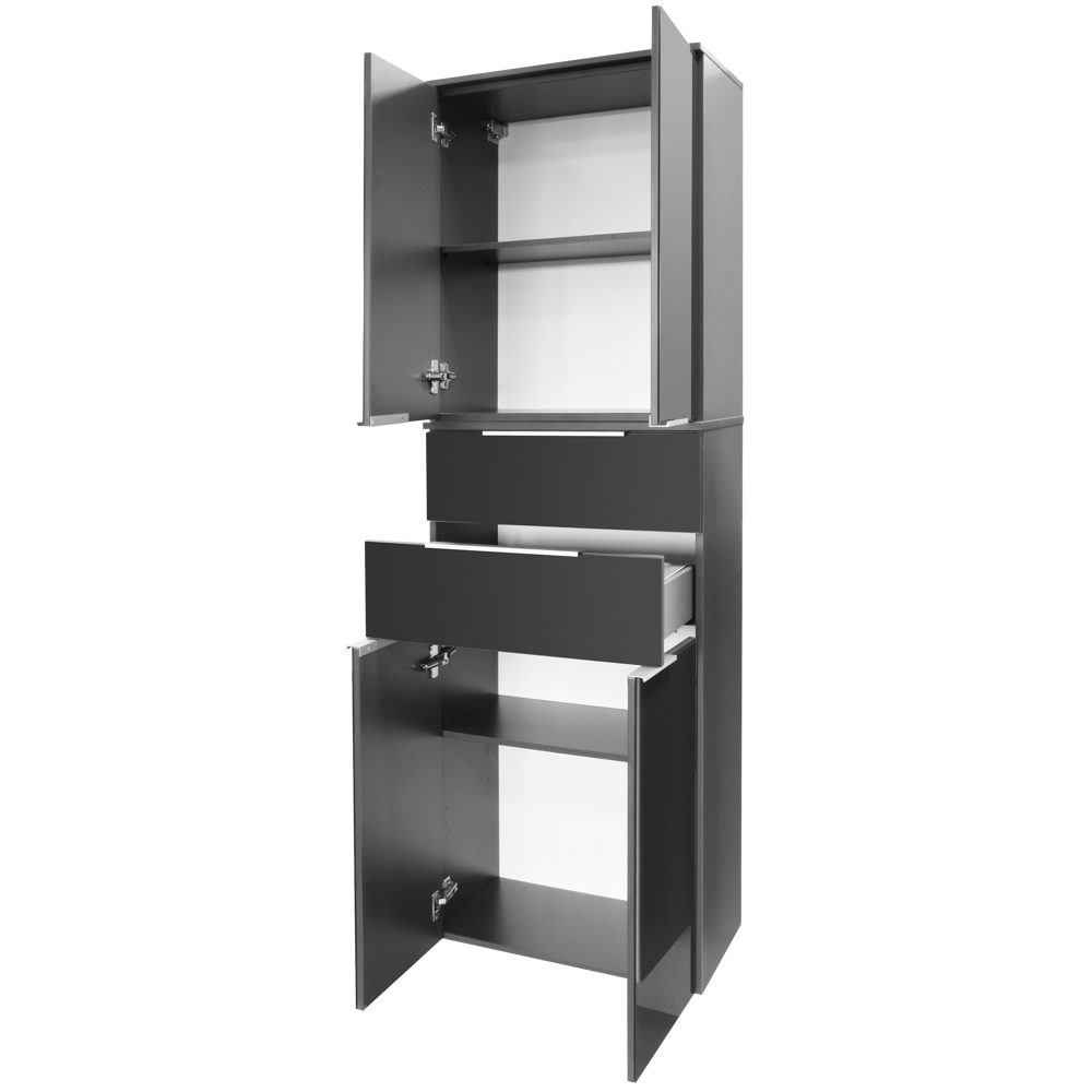 - Szafka łazienkowa boczna, 4-drzwiowa o szerokości 61 cm. Fronty wykonane z lakierowanego szkła w kolorze antracytu.