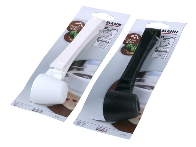 Łyżeczka z miarką oraz klipsem do zamykania torebek niemieckiej firmy Fackelmann wykonana została z trwałego tworzywa- posiada skalę do odmierzania kawy, herbaty czy innych produktów spożywczych w porcji 6 g i 9 g. Dodatkowa funkcja klipsa pozwala na zabezpieczenie świeżości zawartości torebki z kawą czy herbatą.