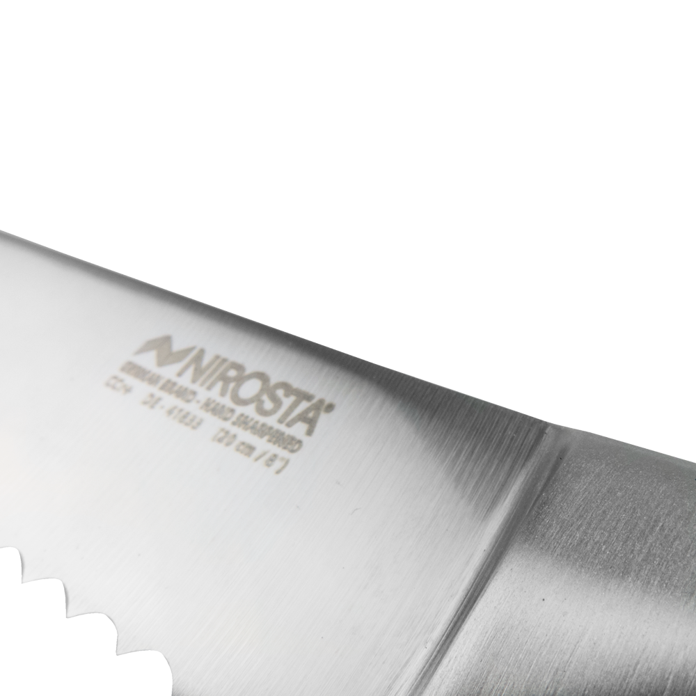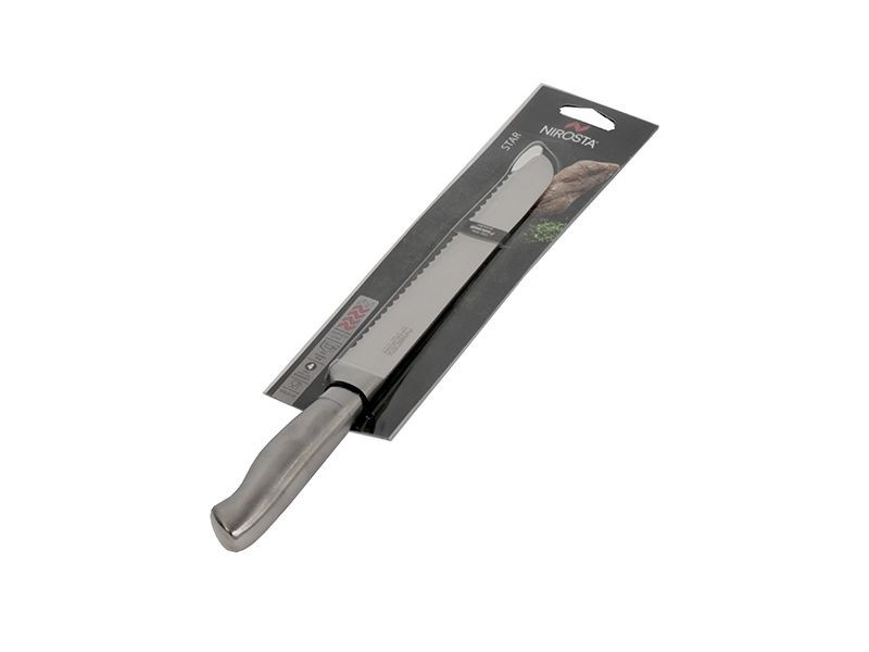 Praktyczny nóż kuchenny niemieckiej firmy Fackelmann – Nirosta, idealnie sprawdzi się w każdych kuchennych warunkach. Nóż posiada szerokie, ząbkowane ostrze, dzięki czemu z łatwością pokroimy każdy rodzaj pieczywa.