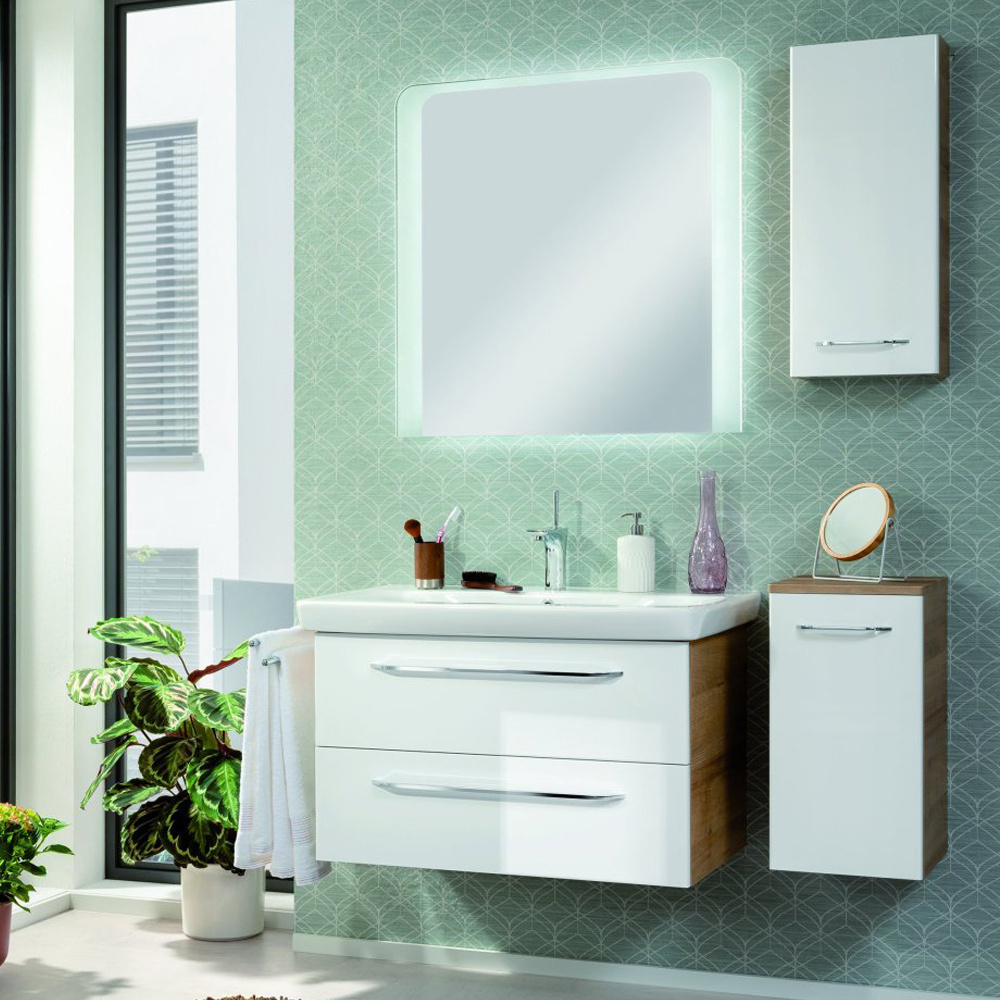 Meble łazienkowe z serii Milano występują w kilku wariantach kolorystycznych, a ich bazę stanowi klasyczna biel, a także czyniący wnętrze bardziej przytulnym - sękaty dąb.