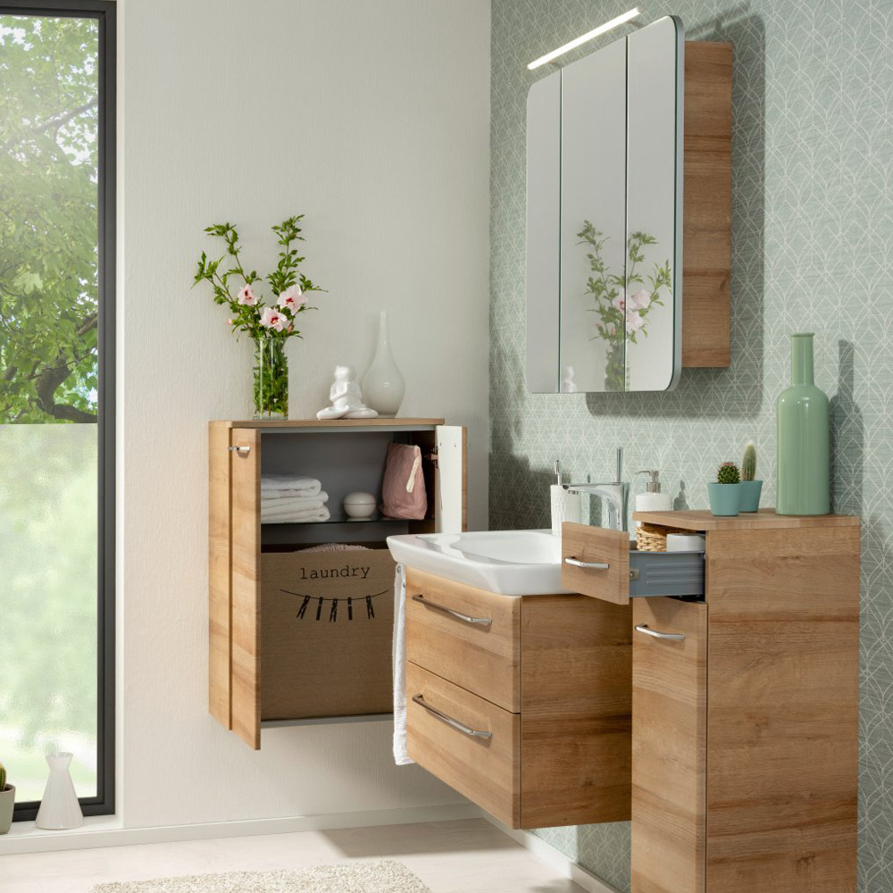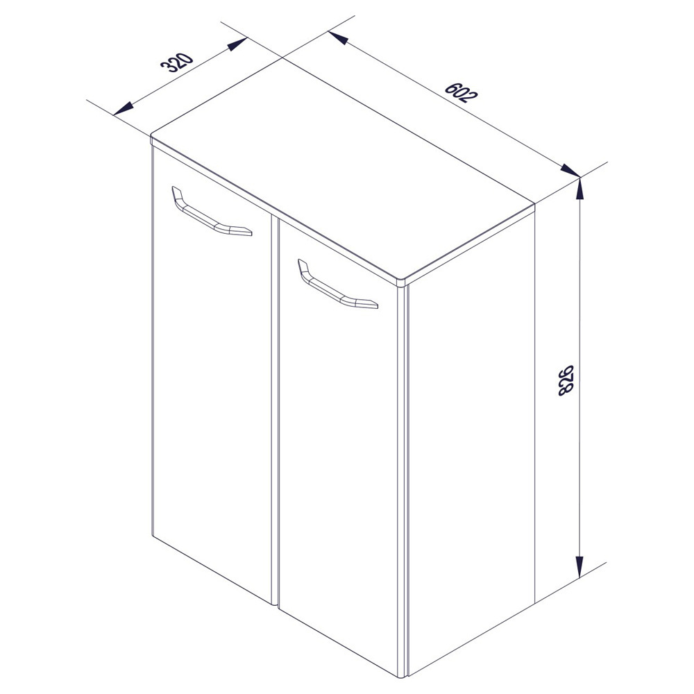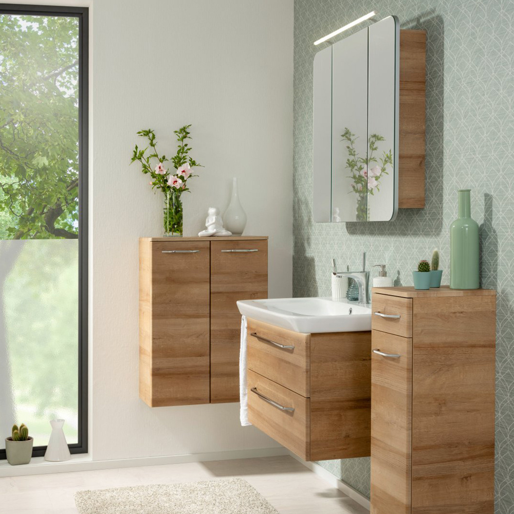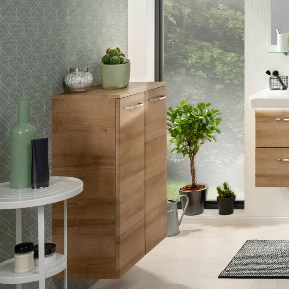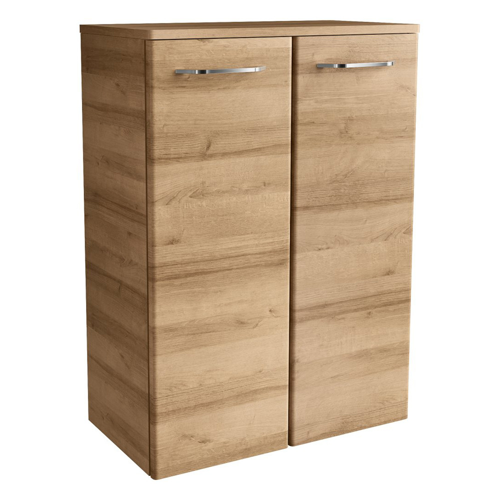 - Szafka łazienkowa boczna, dwudrzwiowa o szerokości 60,2 cm w kolorze sękaty dąb.