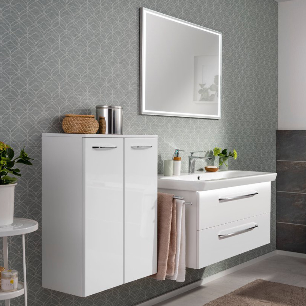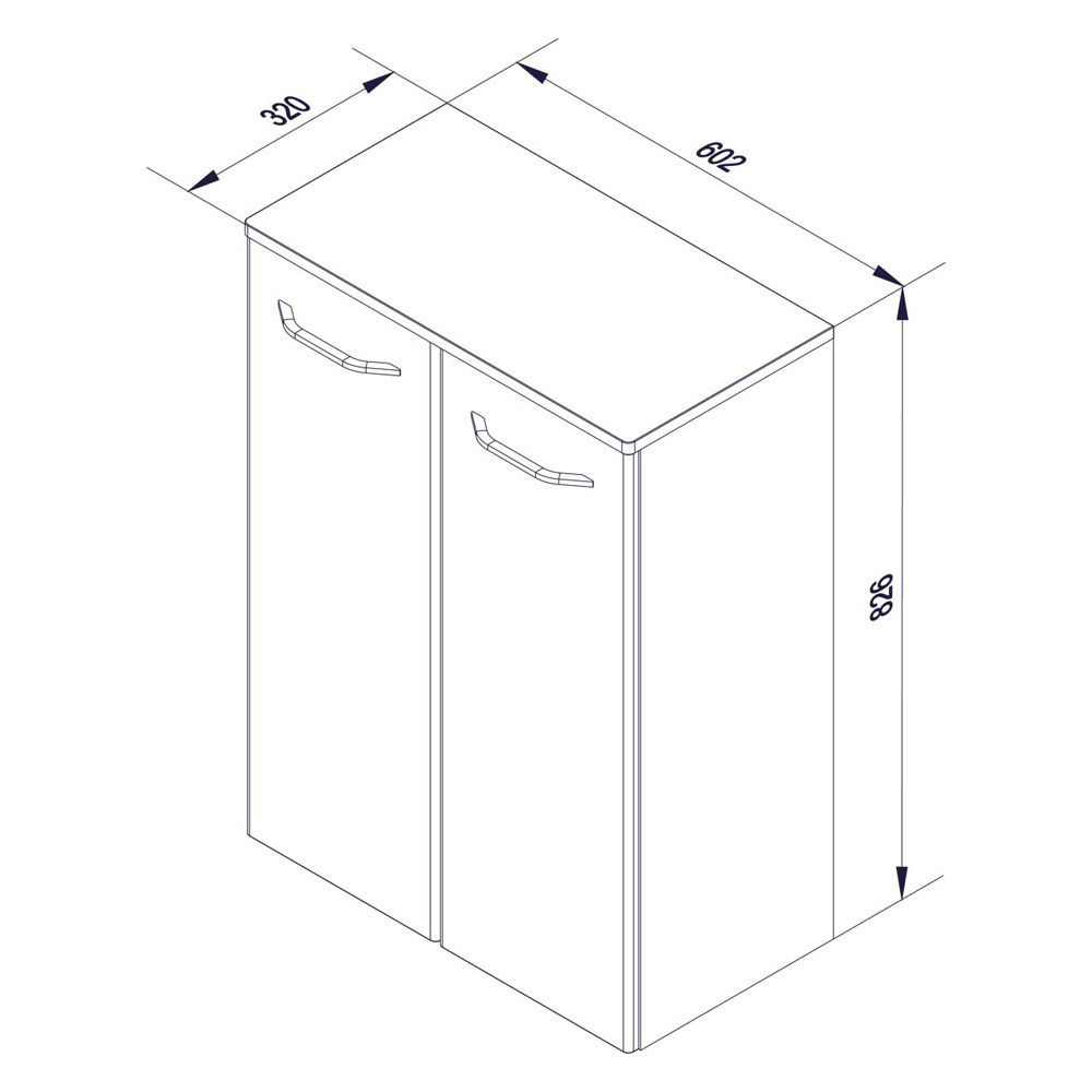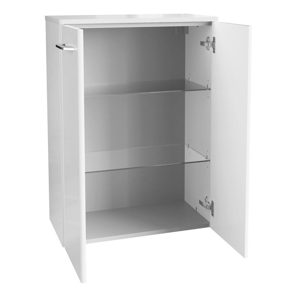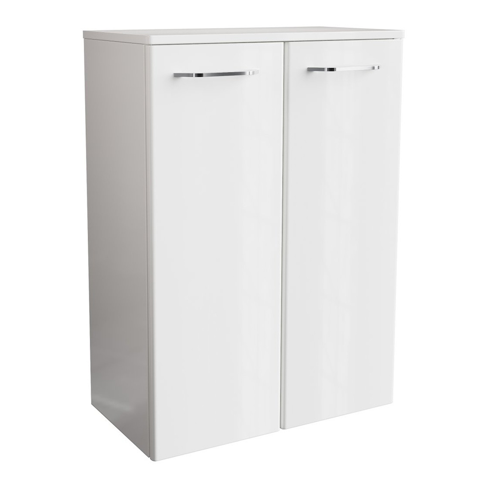 - Biała szafka łazienkowa boczna, dwudrzwiowa o szerokości 60,2 cm.