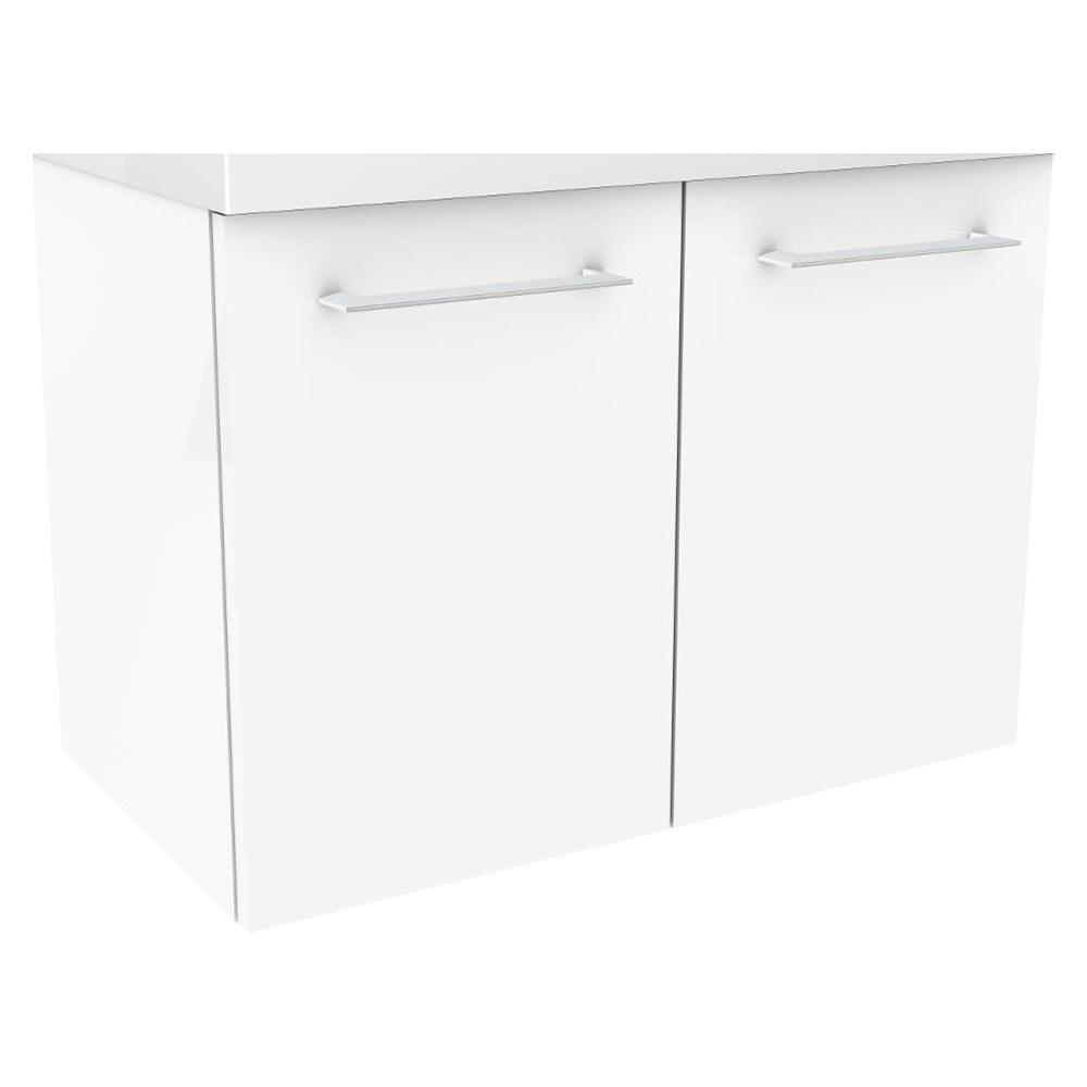 - Zestaw mebli łazienkowych z serii Lima, w skład którego wchodzą: dwudrzwiowa szafka pod umywalkę o szerokości 59,8 cm oraz umywalka z konglomeratu.