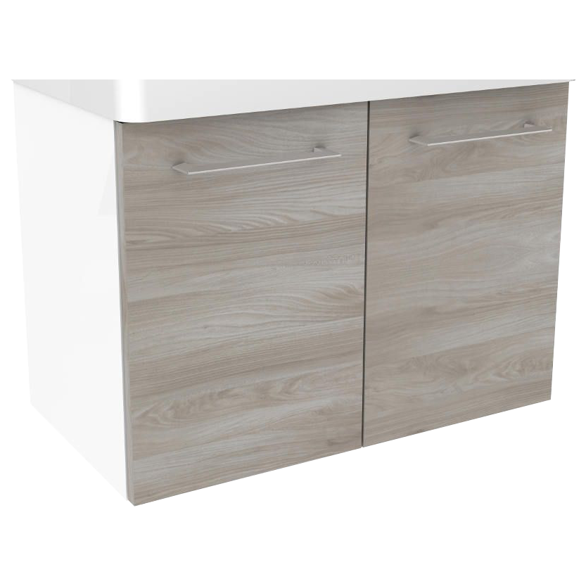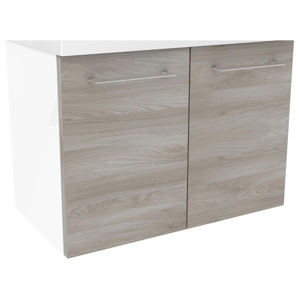 - Zestaw mebli łazienkowych z serii Lima, w skład którego wchodzą: dwudrzwiowa szafka pod umywalkę o szerokości 59,8 cm oraz umywalka z konglomeratu.