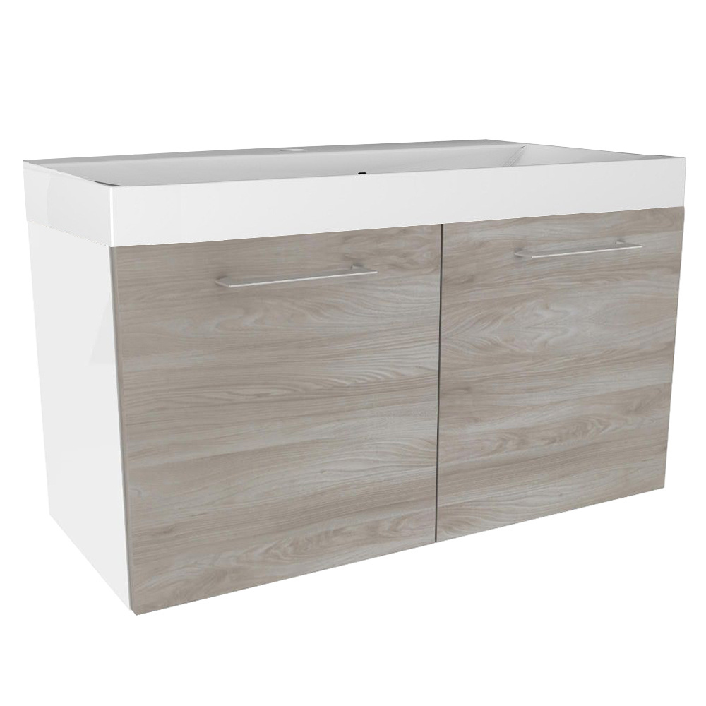- Zestaw mebli łazienkowych z serii Lima, w skład którego wchodzą: dwudrzwiowa szafka pod umywalkę o szerokości 79,8 cm oraz umywalka z konglomeratu.