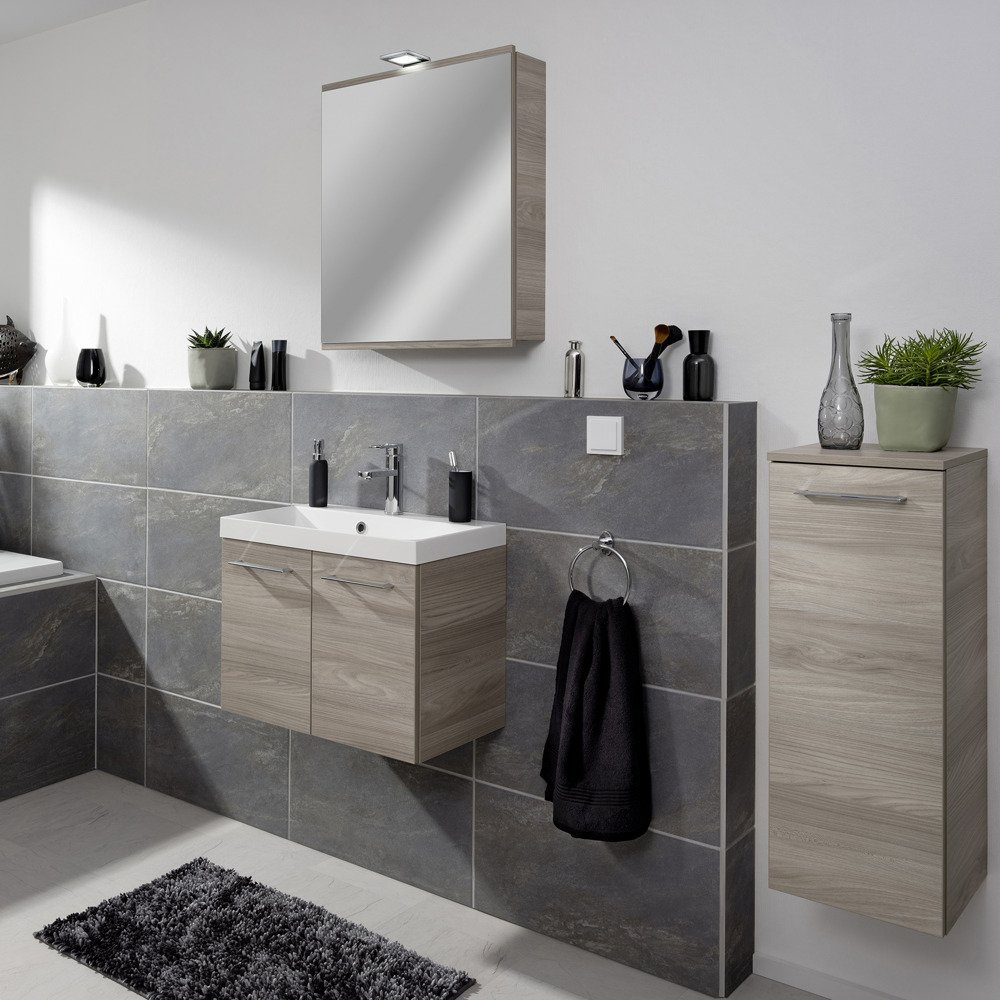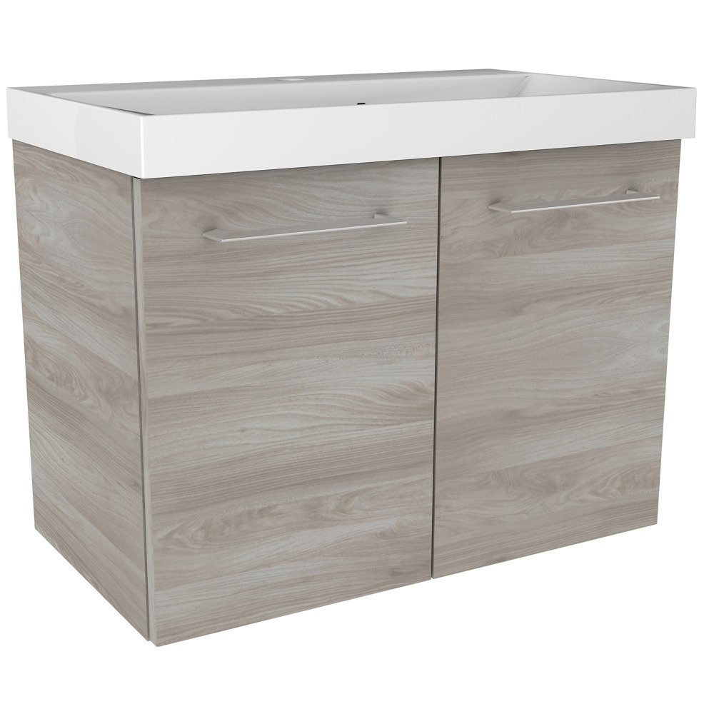 - Zestaw mebli łazienkowych z serii Lima, w skład którego wchodzą: dwudrzwiowa szafka pod umywalkę o szerokości 59,8 cm oraz umywalka z konglomeratu.