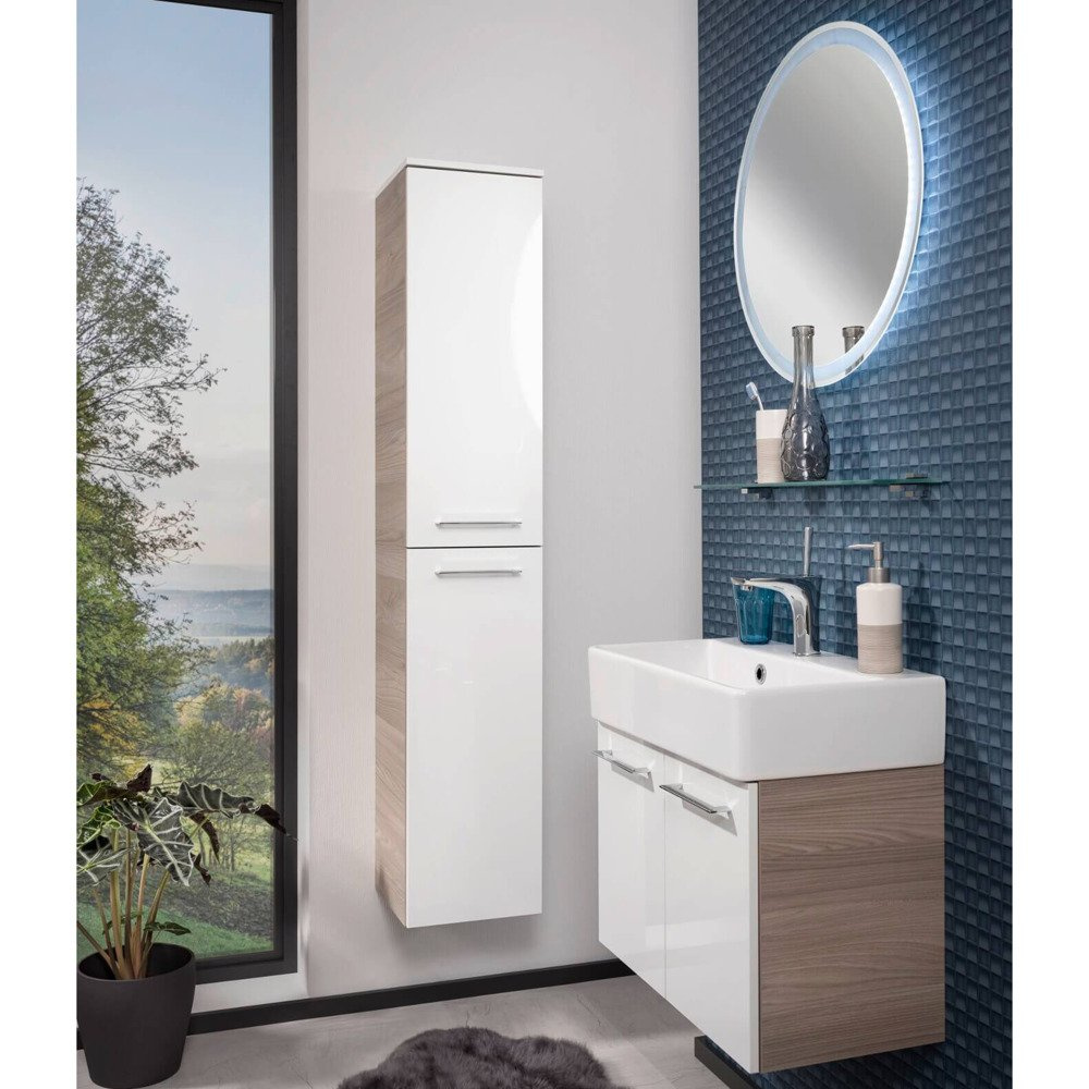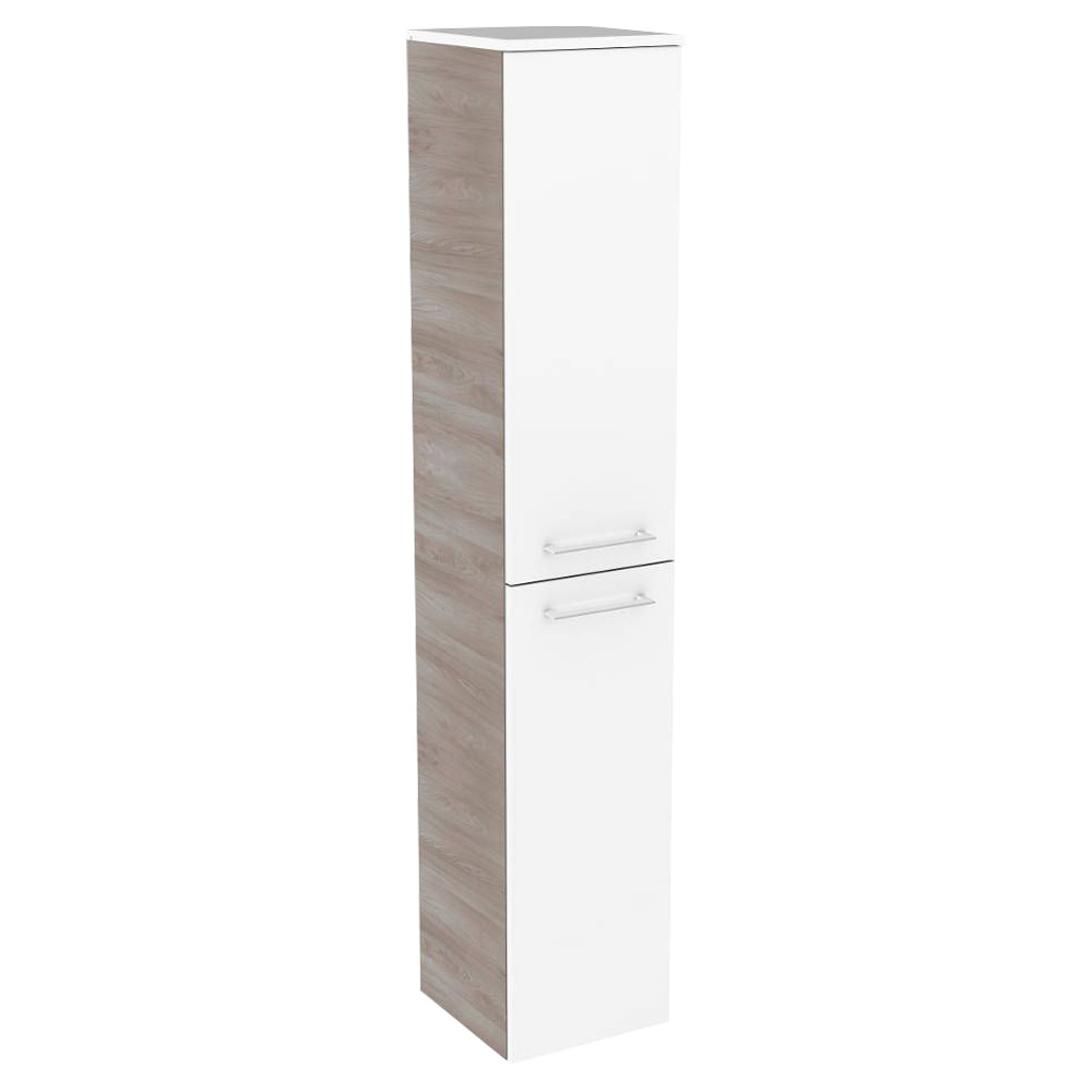 - Szafka łazienkowa boczna, wisząca o wysokości 160,4 cm z korpusem oraz frontem w kolorze szary dąb.