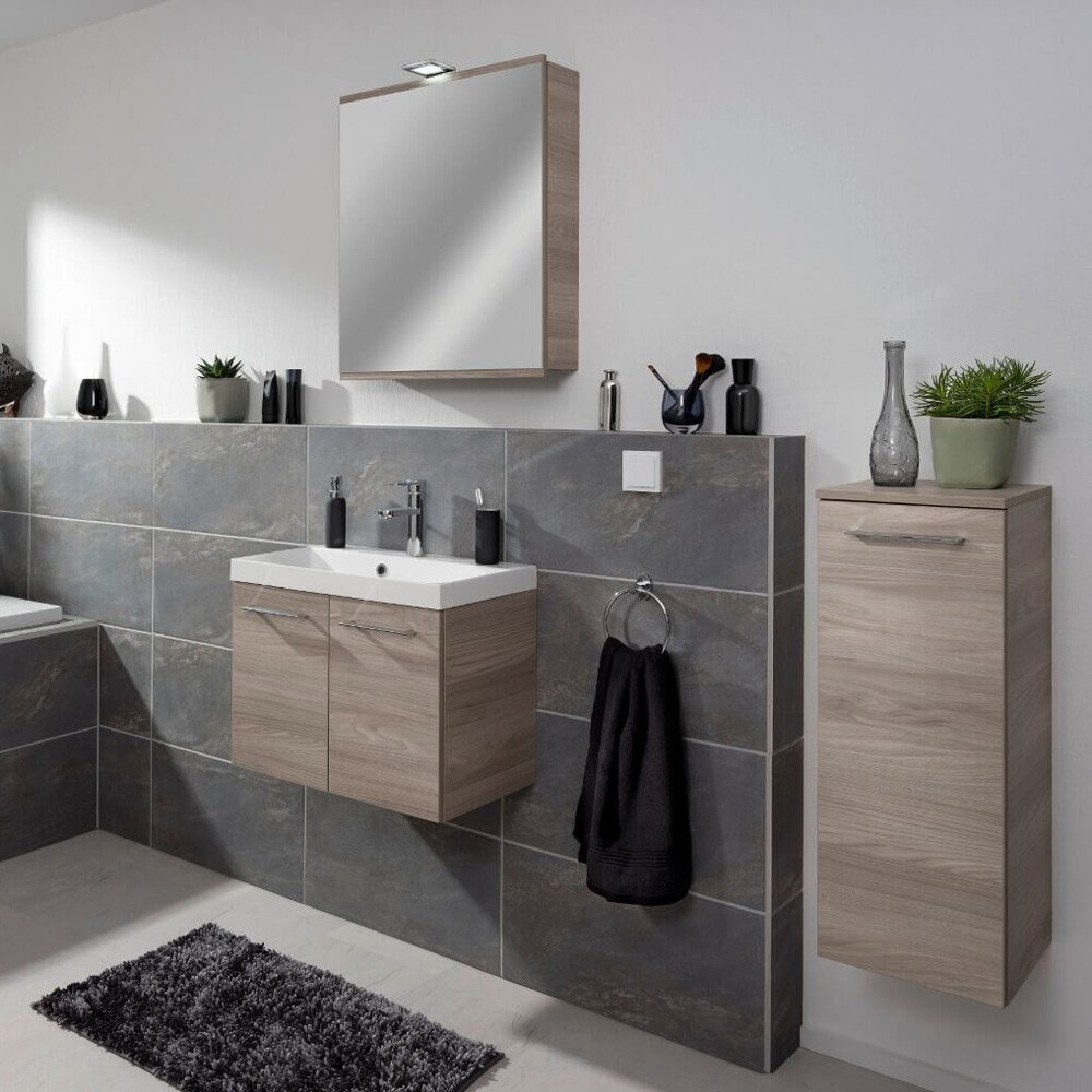 - Szafka łazienkowa boczna, wisząca o wysokości 81 cm w kolorze szary dąb.