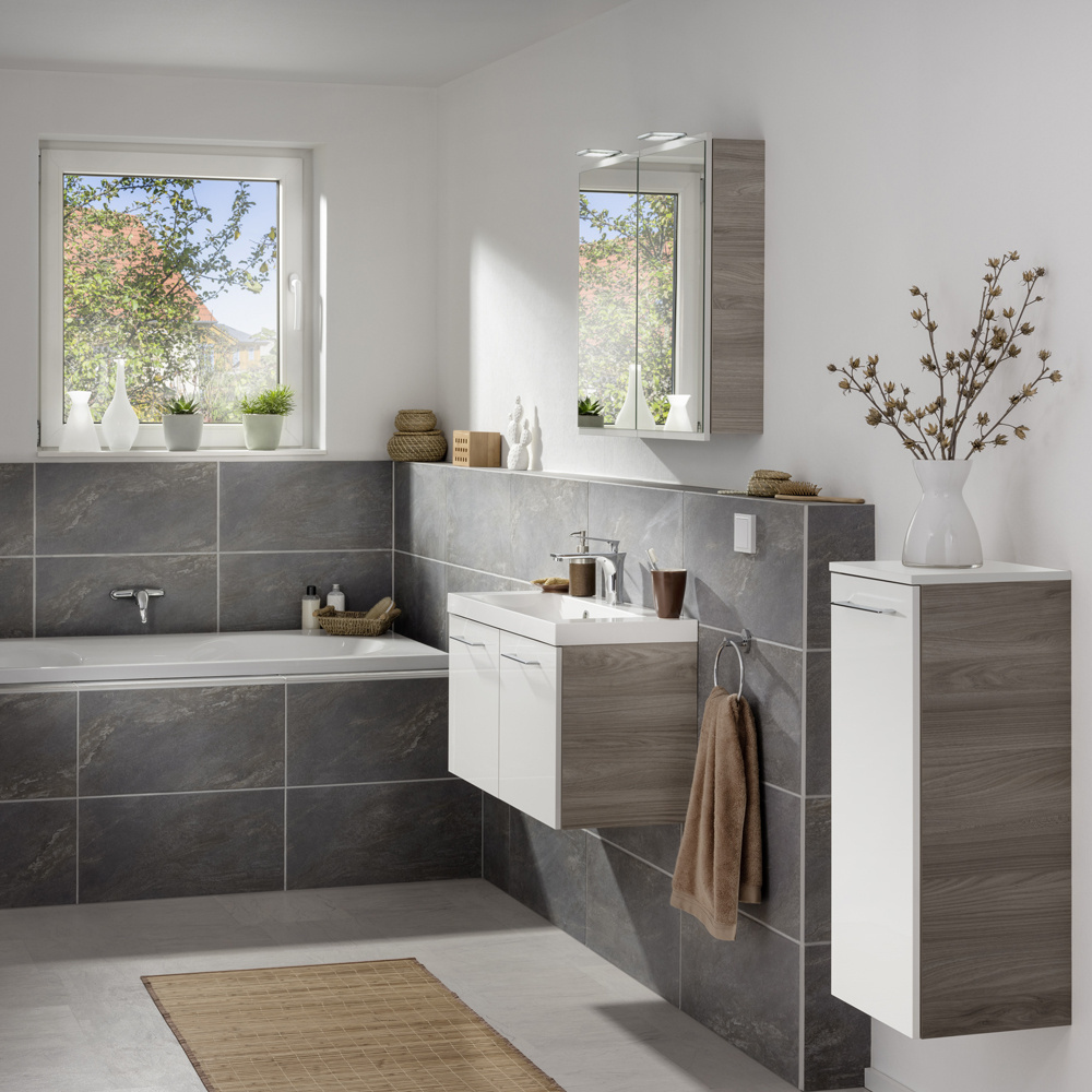 Szafki lustrzane występują w tej kolekcji w dwóch rozmiarach: jednodrzwiowa, o szerokości 60 cm oraz dwudrzwiowa z efektem 3D o szerokości 80 cm. Szafki wyposażone są w oświetlenie LED, które doskonale oświetla taflę lustra oraz otoczenie.