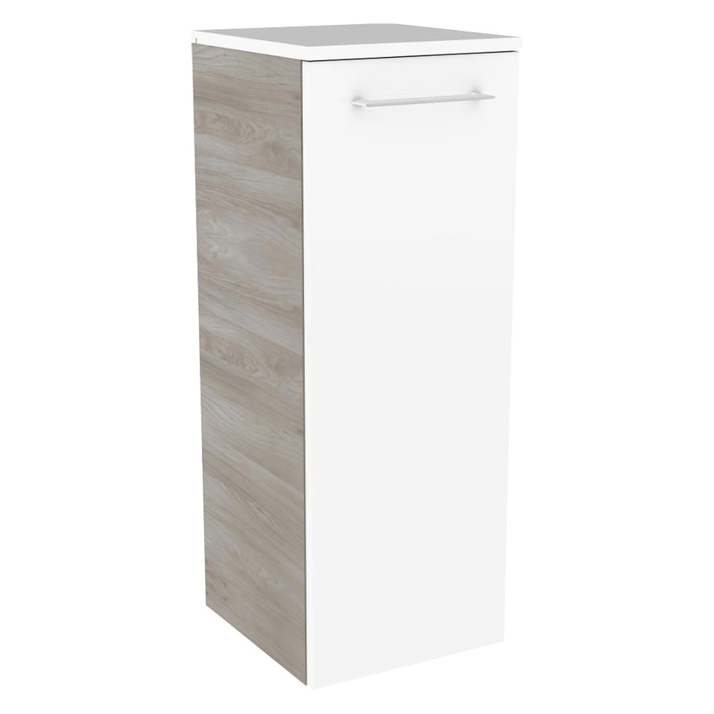 - Szafka łazienkowa boczna, wisząca o wysokości 81 cm z korpusem w kolorze szary dąb oraz frontem i górnym blatem w kolorze białym.
