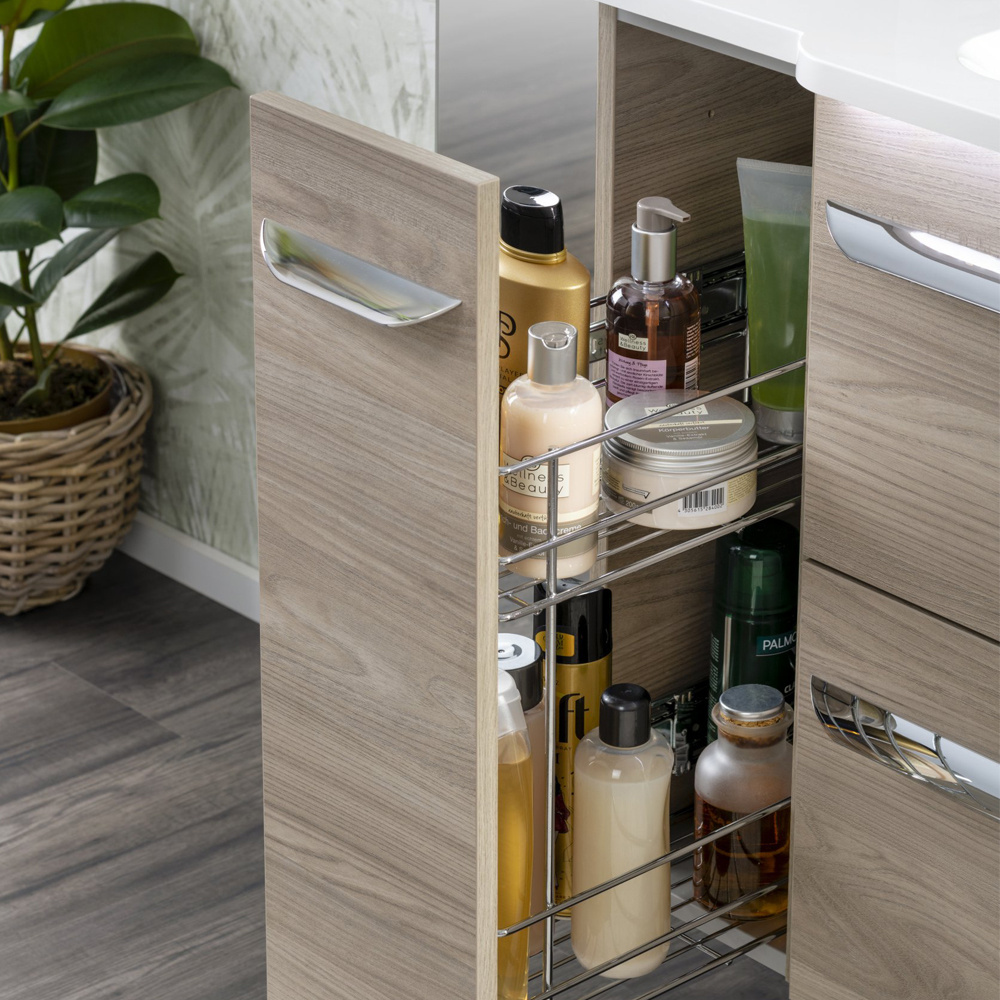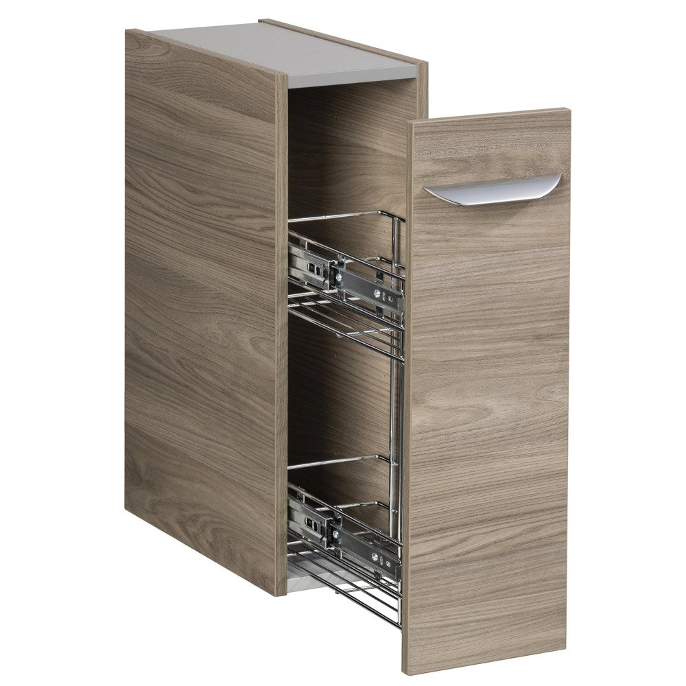 - Szafka łazienkowa boczna cargo, o szerokości 20 cm, dzięki której możliwa jest rozbudowa szafki pod umywalkę (79801) do 100 lub 120 cm. Korpus oraz front w kolorze szary dąb.