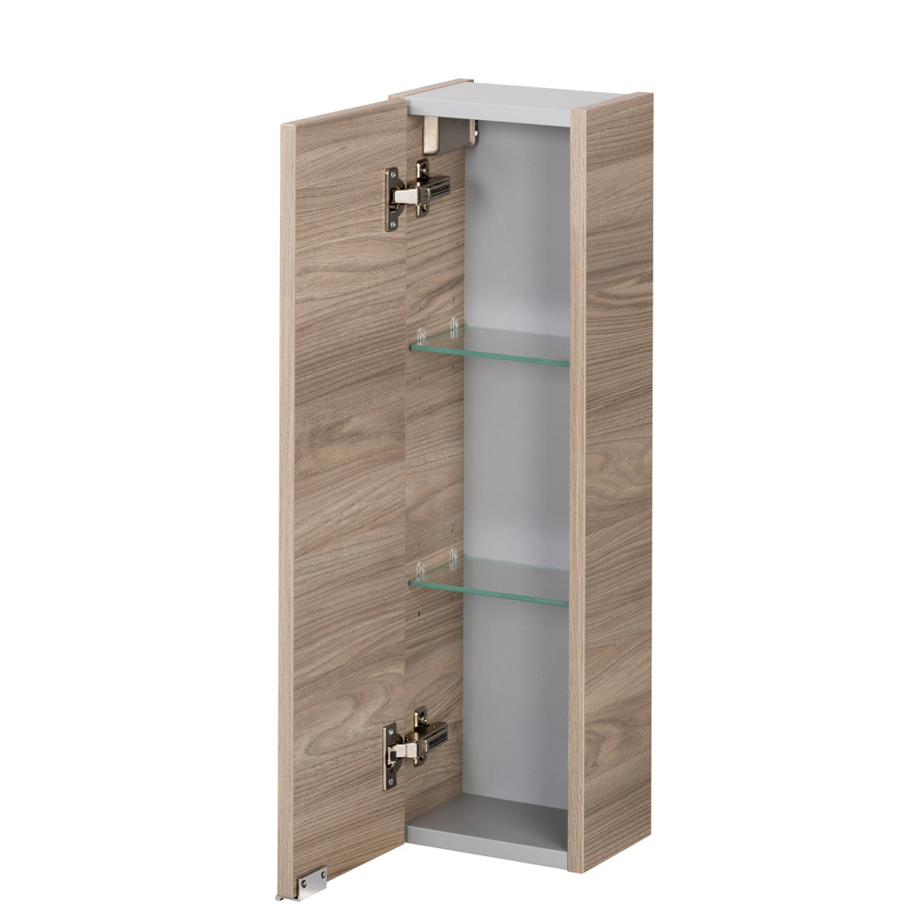 - Szafka łazienkowa boczna, lewa, o szerokości 20 cm, dzięki której możliwa jest rozbudowa lustrzanej szafki wiszącej (79891) do 100 lub 120 cm. Korpus oraz front w kolorze szary dąb.