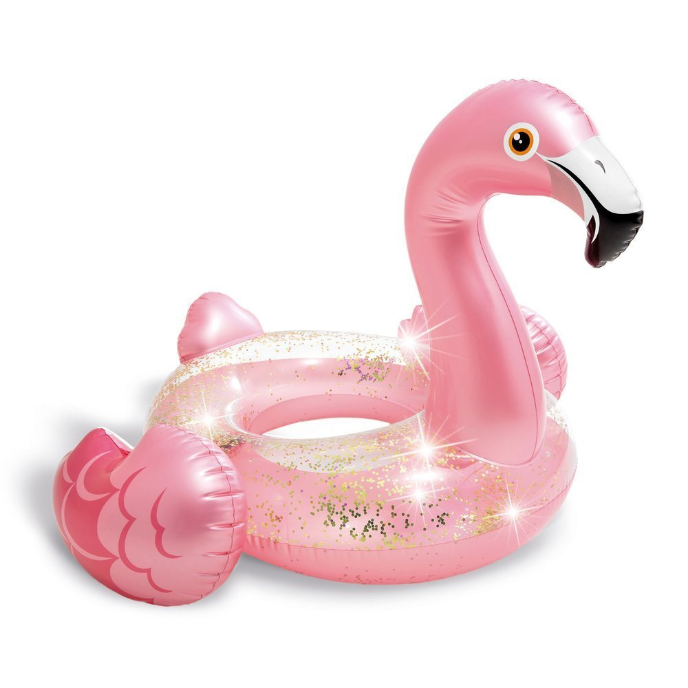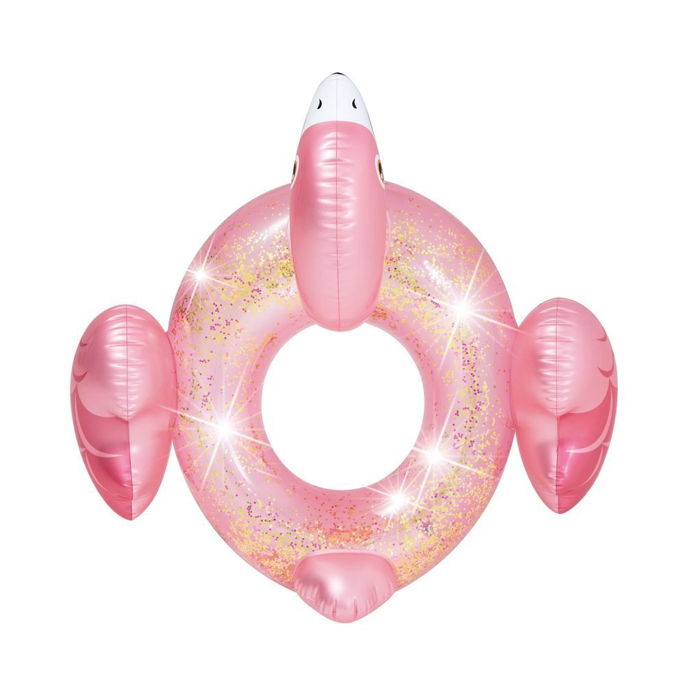 Piękne koło do pływania w kształcie flaminga z połyskującymi w słońcu drobinkami brokatu. Szybki i łatwy do napompowania dzięki zastosowaniu 2 komór powietrznych