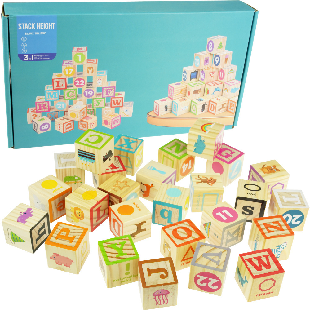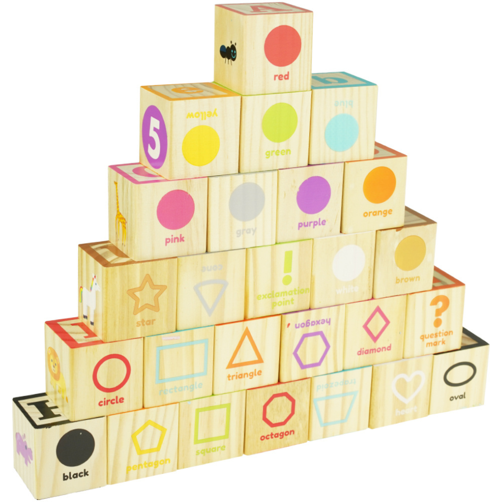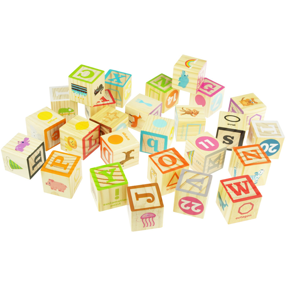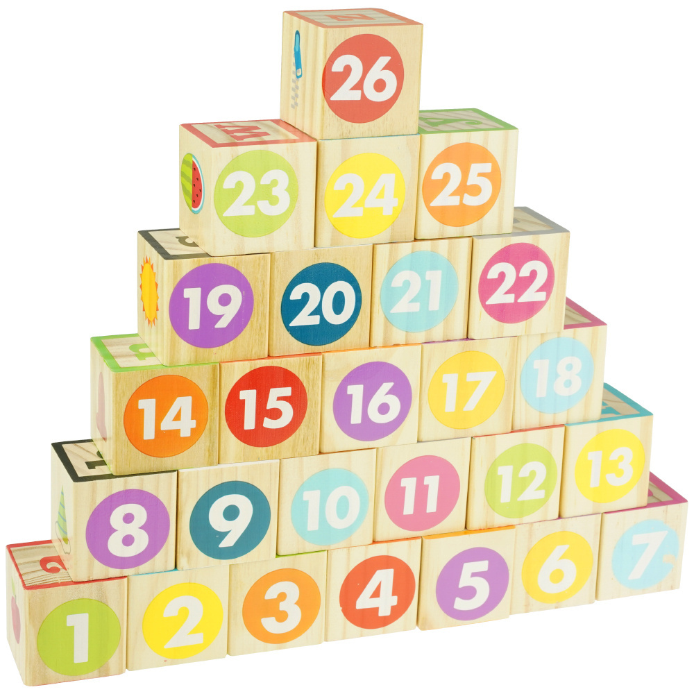 Zestaw 26 klocków wykonanych z wysokiej jakości drewna. Wykonane z ekologicznego i trwałego materiału jakim jest drewno sprawia, że będą one służyły zabawie przez wiele lat.